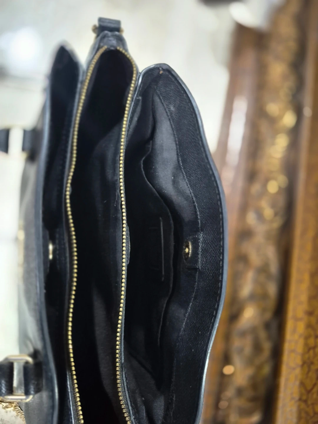 This is a black pebble leather satchel handbag from Coach. It features gold-tone hardware and a detachable crossbody strap. The interior has multiple compartments for organization.