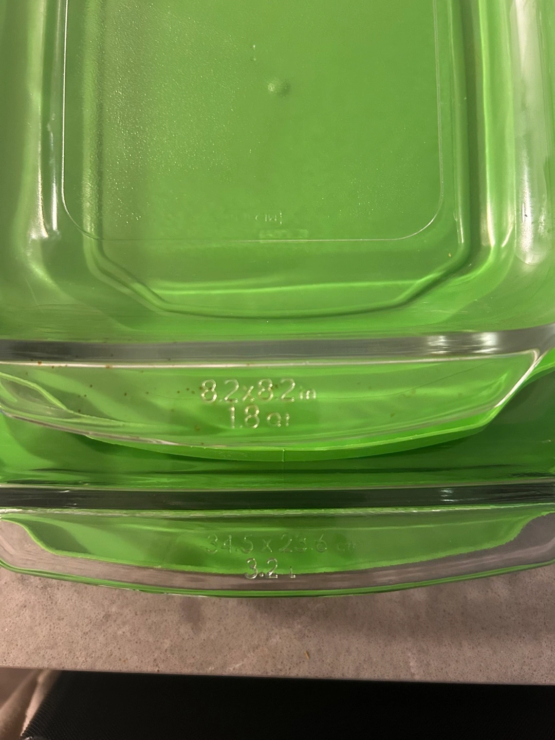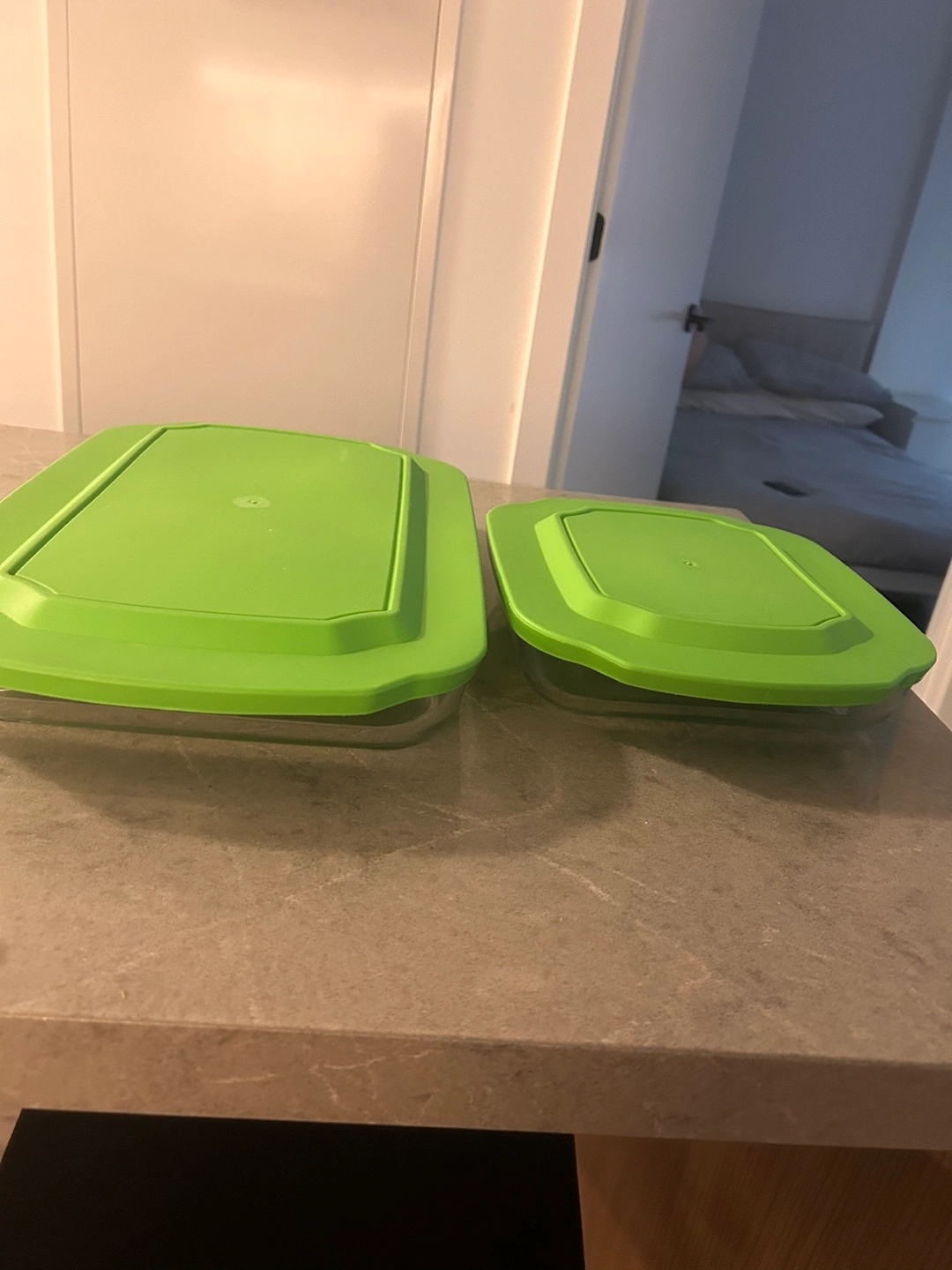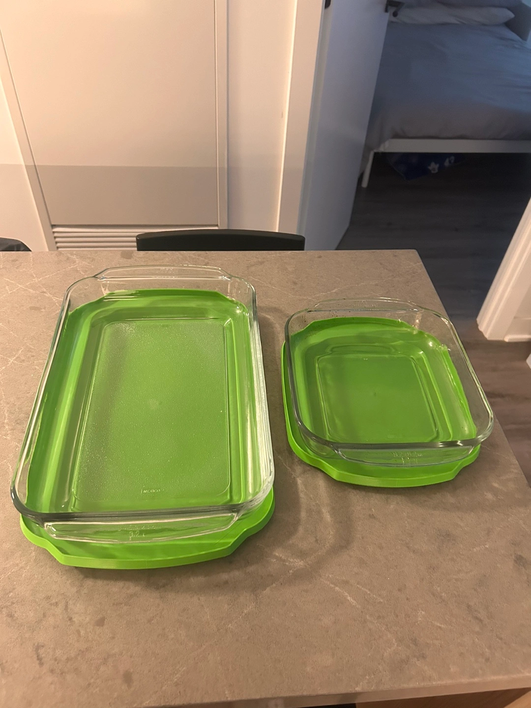 Two Pyrex glass baking dishes with green lids. One rectangular dish and one square dish. Tiny burn marks on the smaller one. Available for pickup only at 425 Wellington Street West