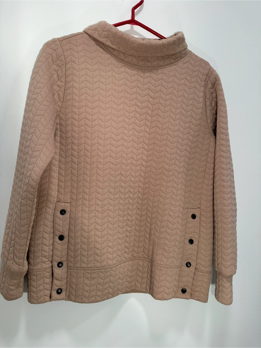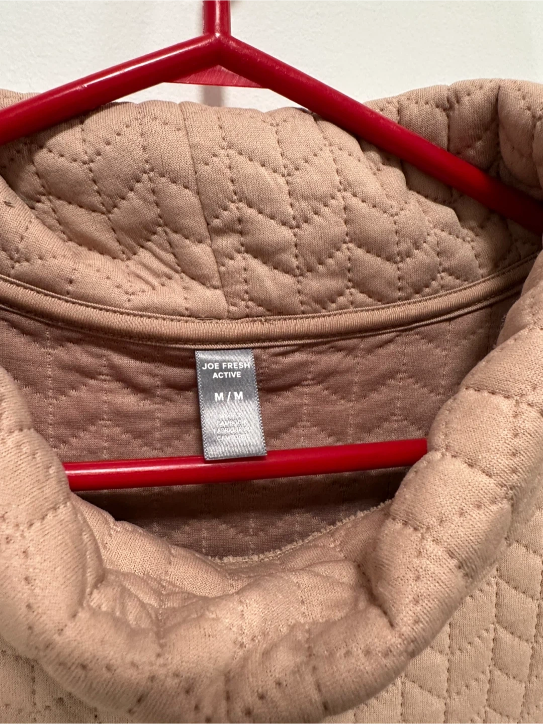 This Joe Fresh Active sweatshirt is made of a soft, quilted material. It features a mock neck and decorative buttons on the sides. Size is medium/medium.