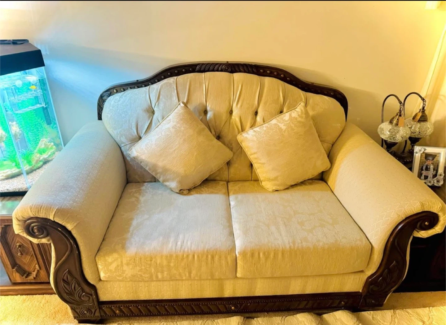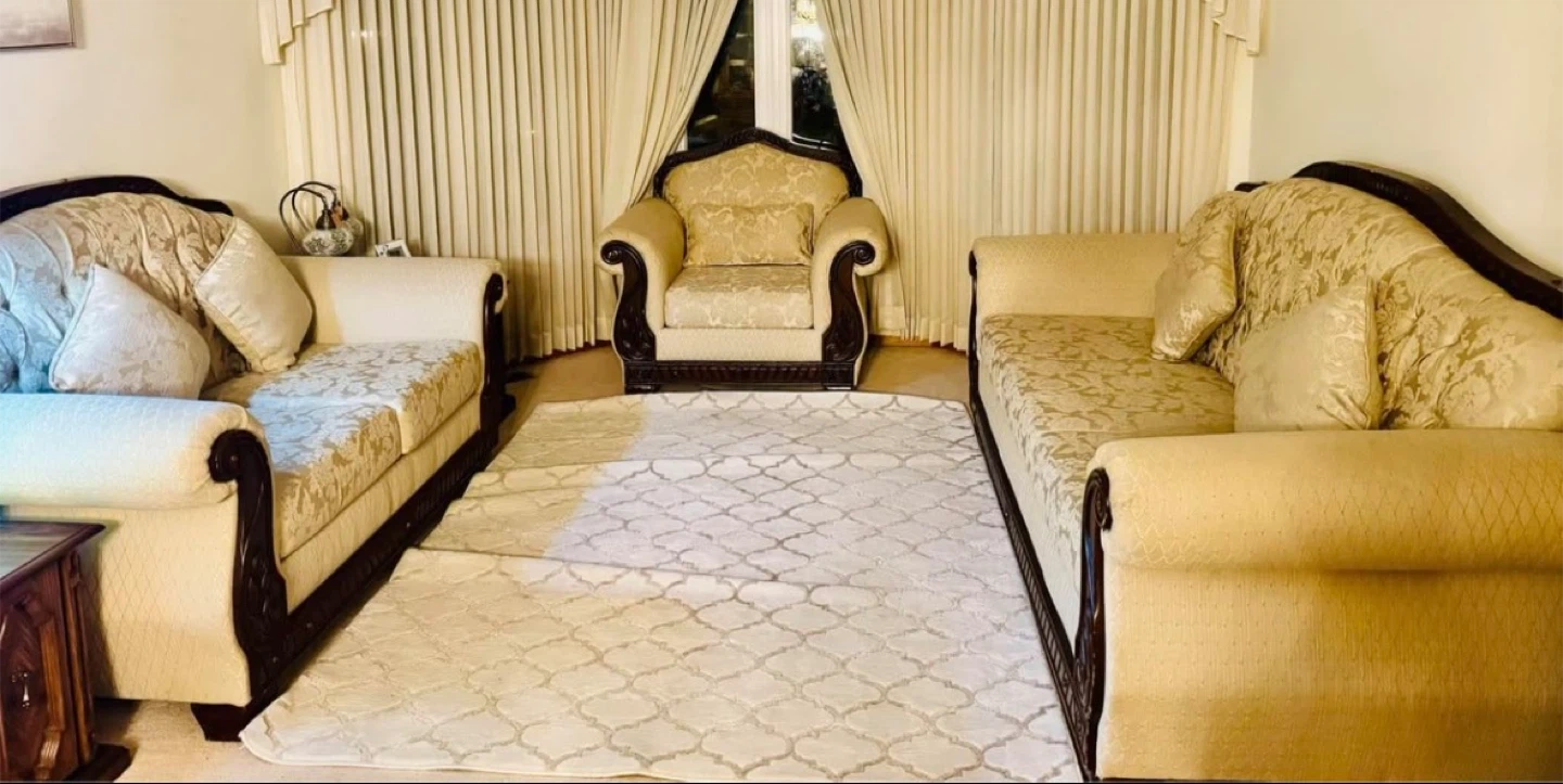 Elegant beige upholstered sofa and armchair set with ornate dark wood trim. Features tufted backs and patterned fabric. This set includes a three-seater sofa, a two-seater sofa, and one armchair. It's a stylish addition to any living room!