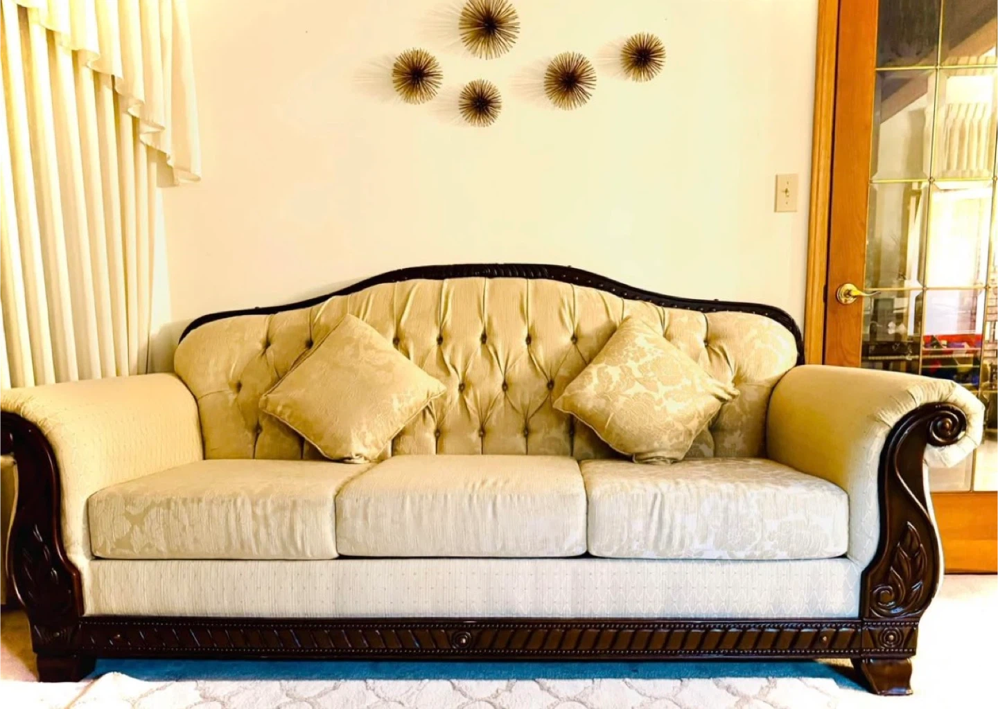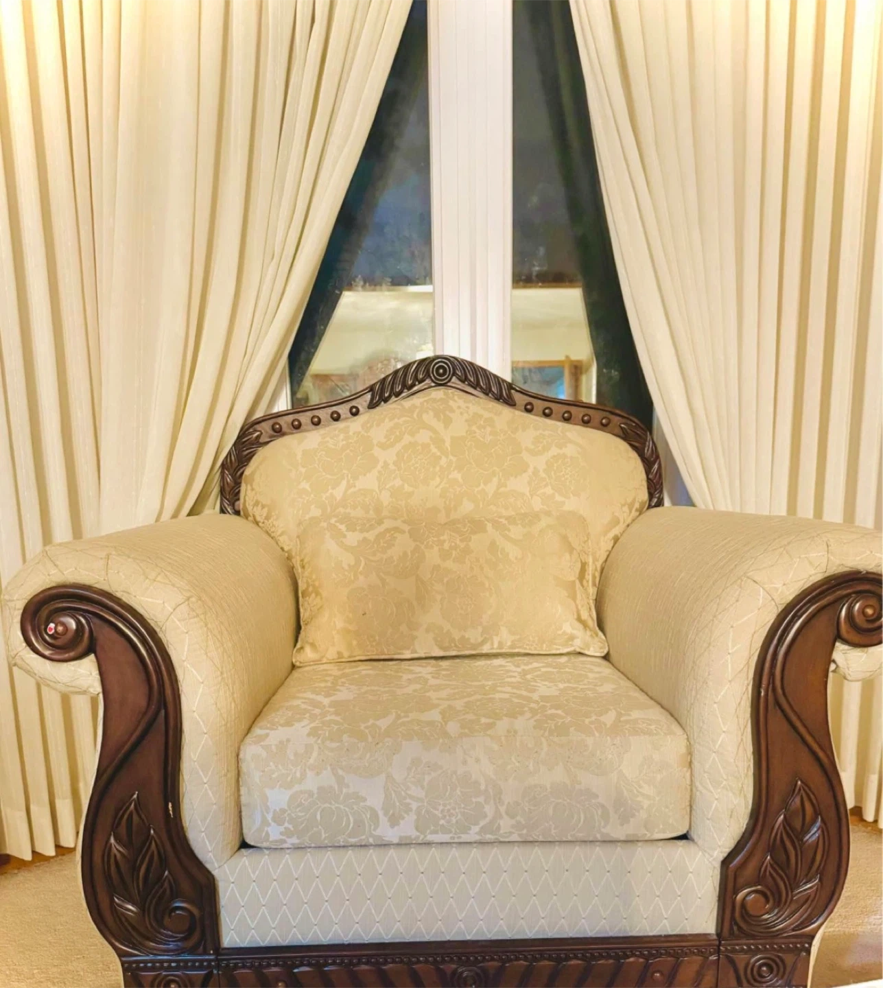 Elegant beige upholstered sofa and armchair set with ornate dark wood trim. Features tufted backs and patterned fabric. This set includes a three-seater sofa, a two-seater sofa, and one armchair. It's a stylish addition to any living room!