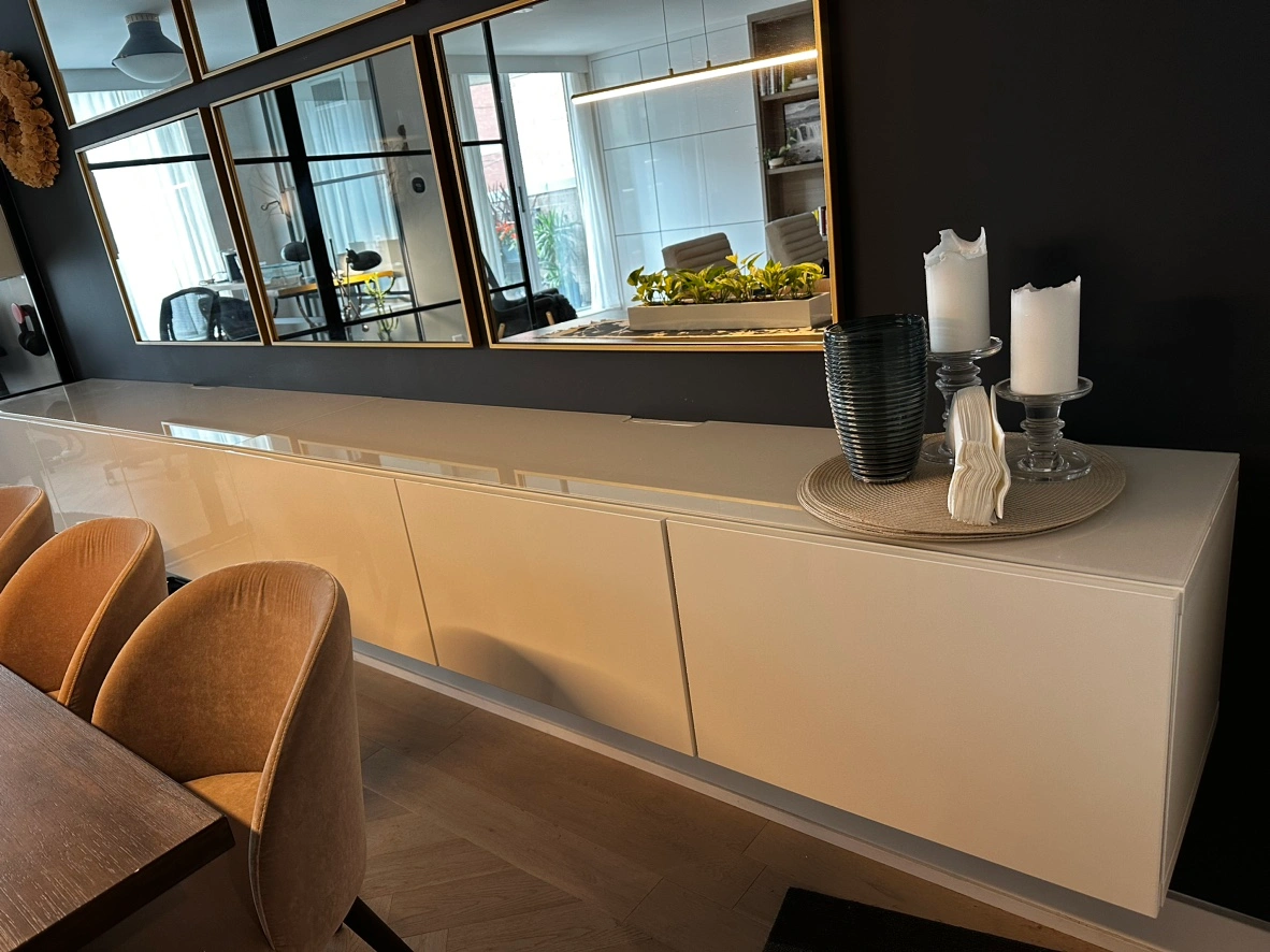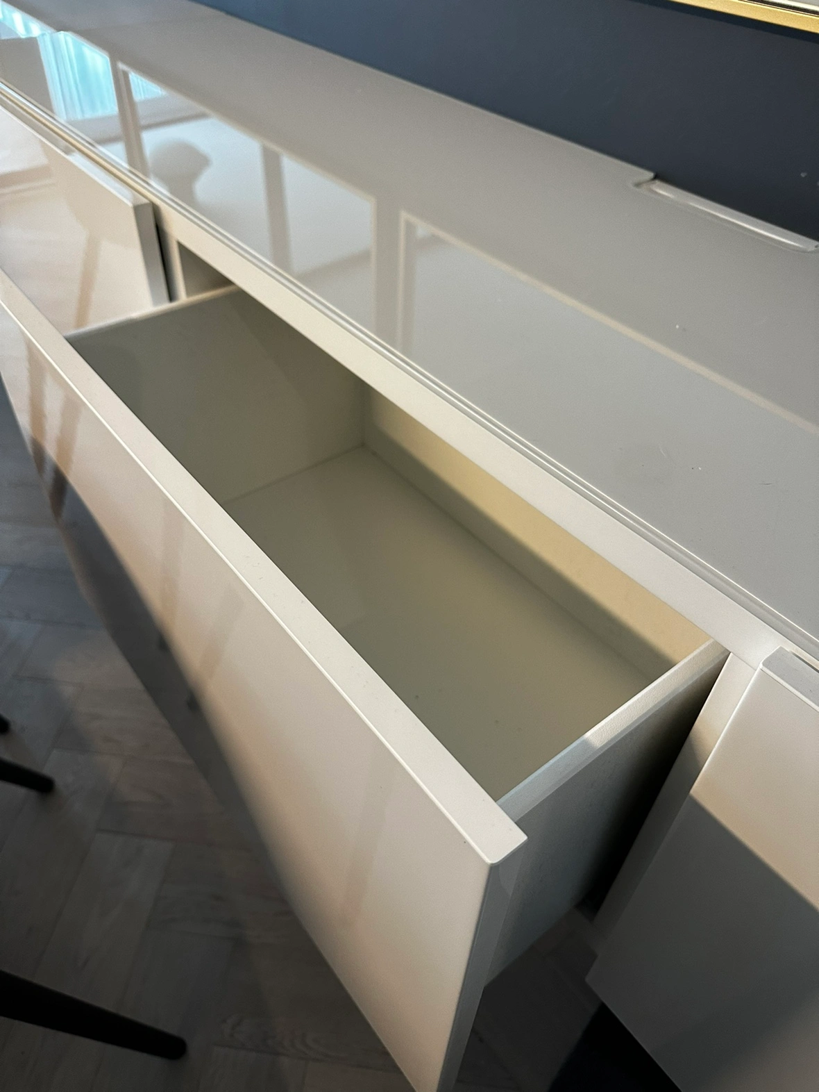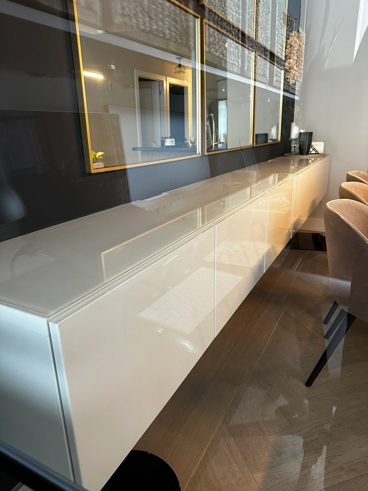 2 IKEA Besta wall mounted tv units with gloss white drawer fronts and white glass tops. In perfect condition. Each unit has space to feed cables. 1 unit is 71” wide.