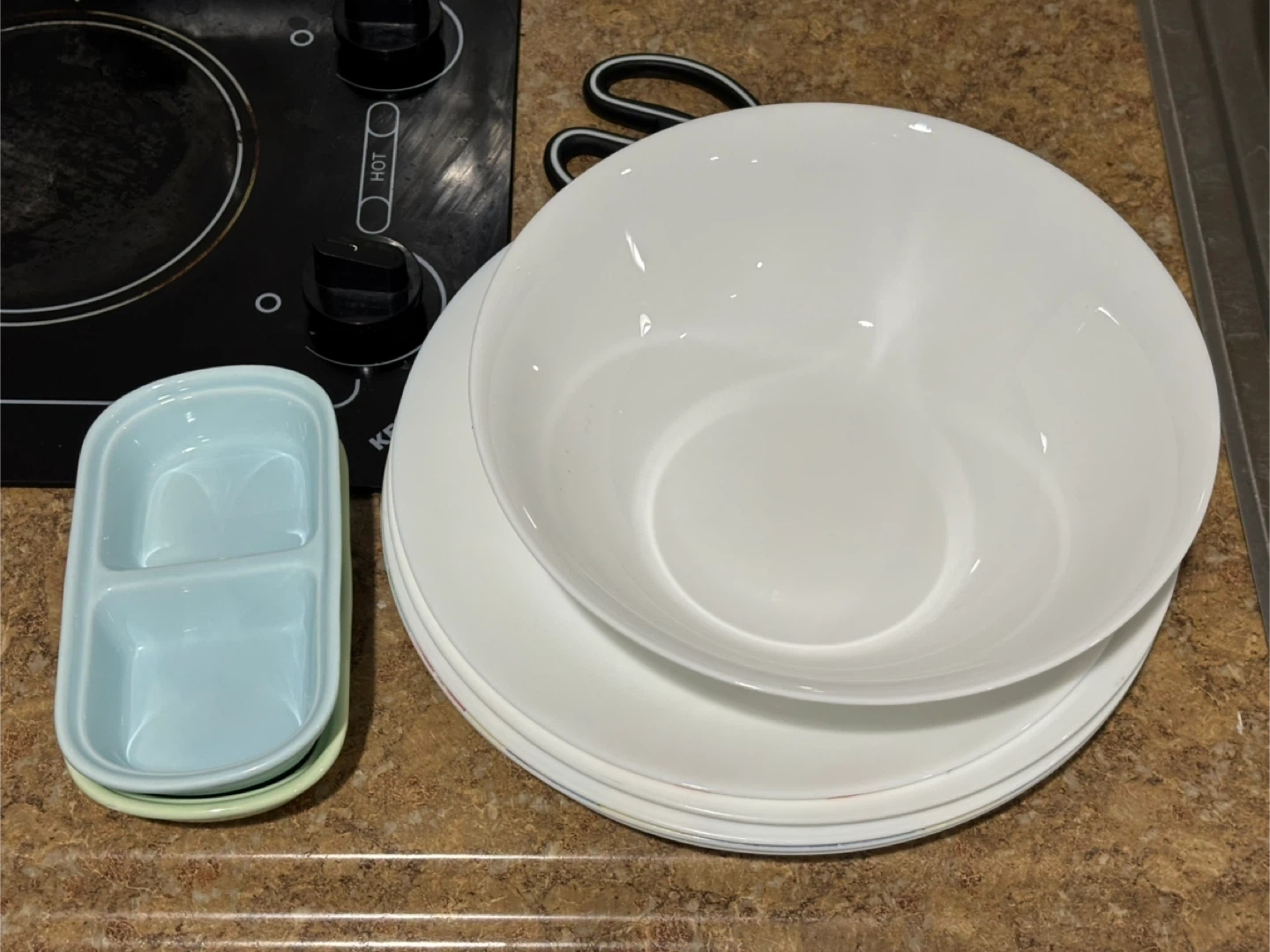 Set includes one large white serving bowl and five white plates. Also includes a two-section dish.