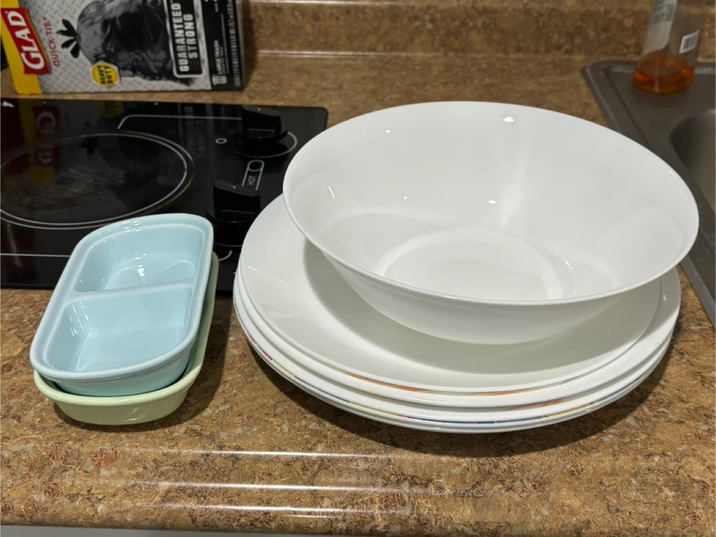 Set includes one large white serving bowl and five white plates. Also includes a two-section dish.