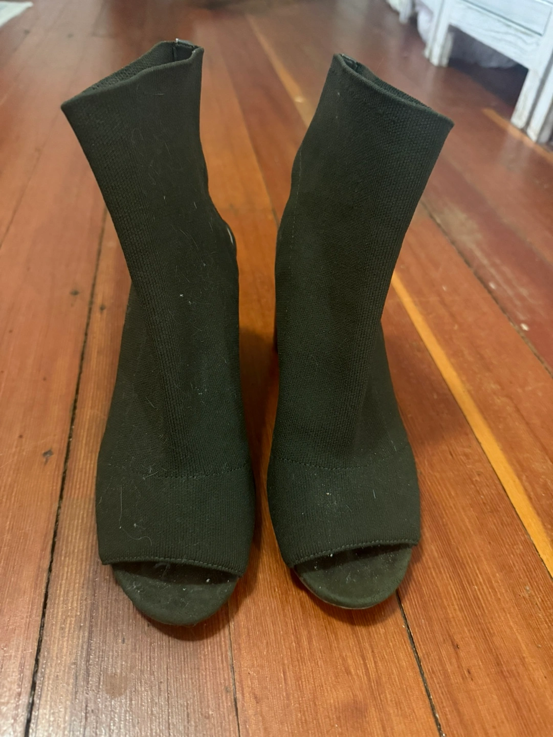 These Steve Madden booties feature a knitted olive green upper with a peep-toe design. They have a block heel. Only worn a couple of times so they are in excellent condition.
