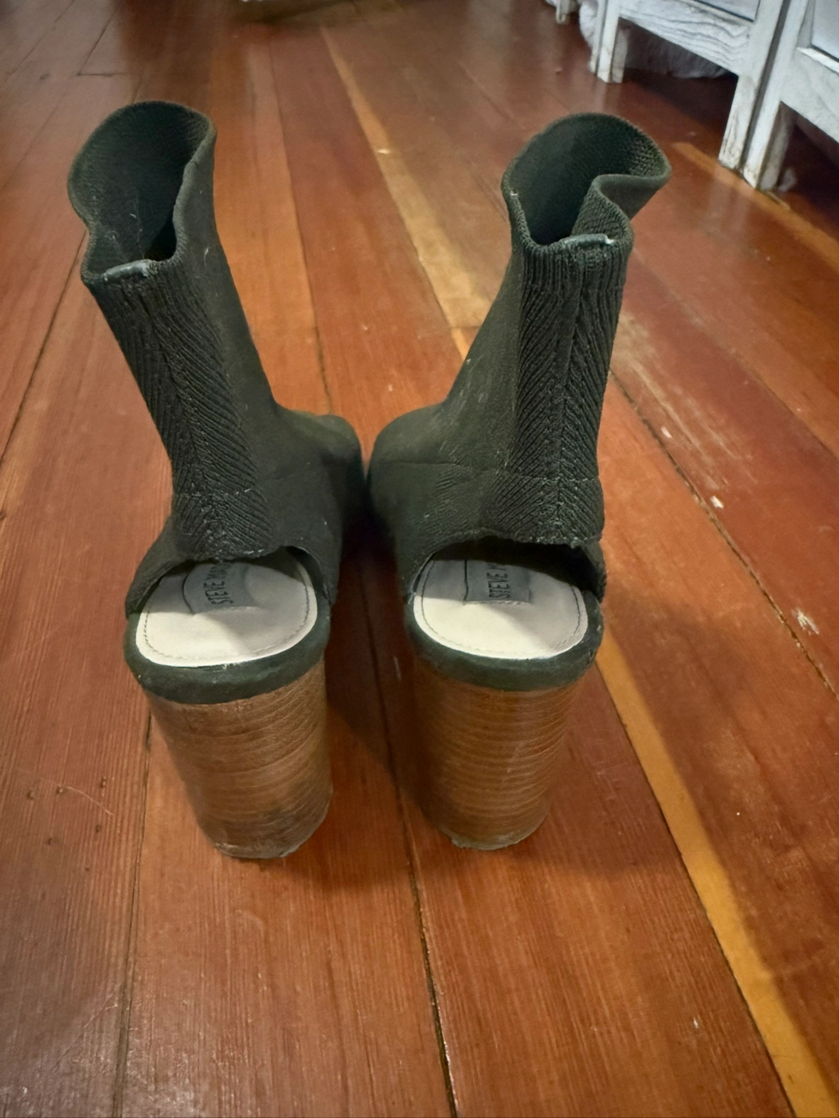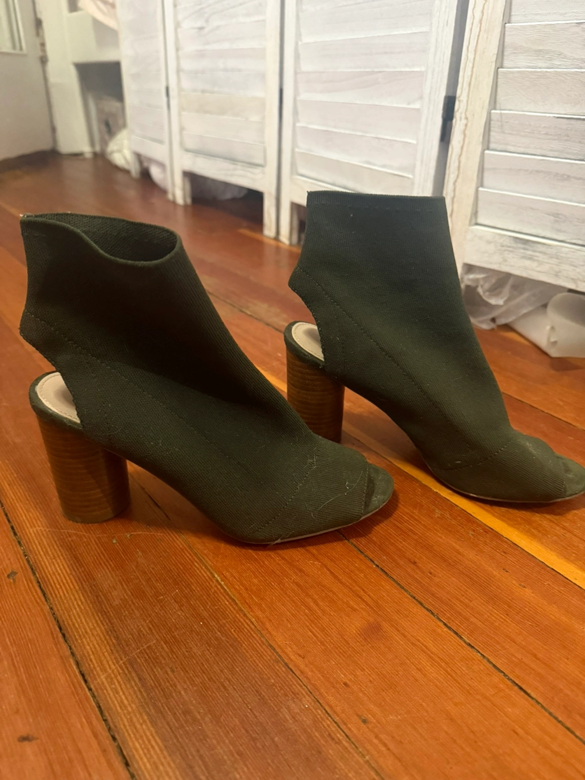 These Steve Madden booties feature a knitted olive green upper with a peep-toe design. They have a block heel. Only worn a couple of times so they are in excellent condition.