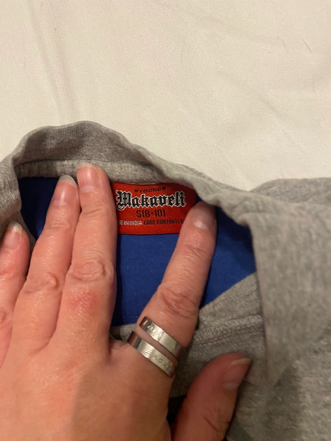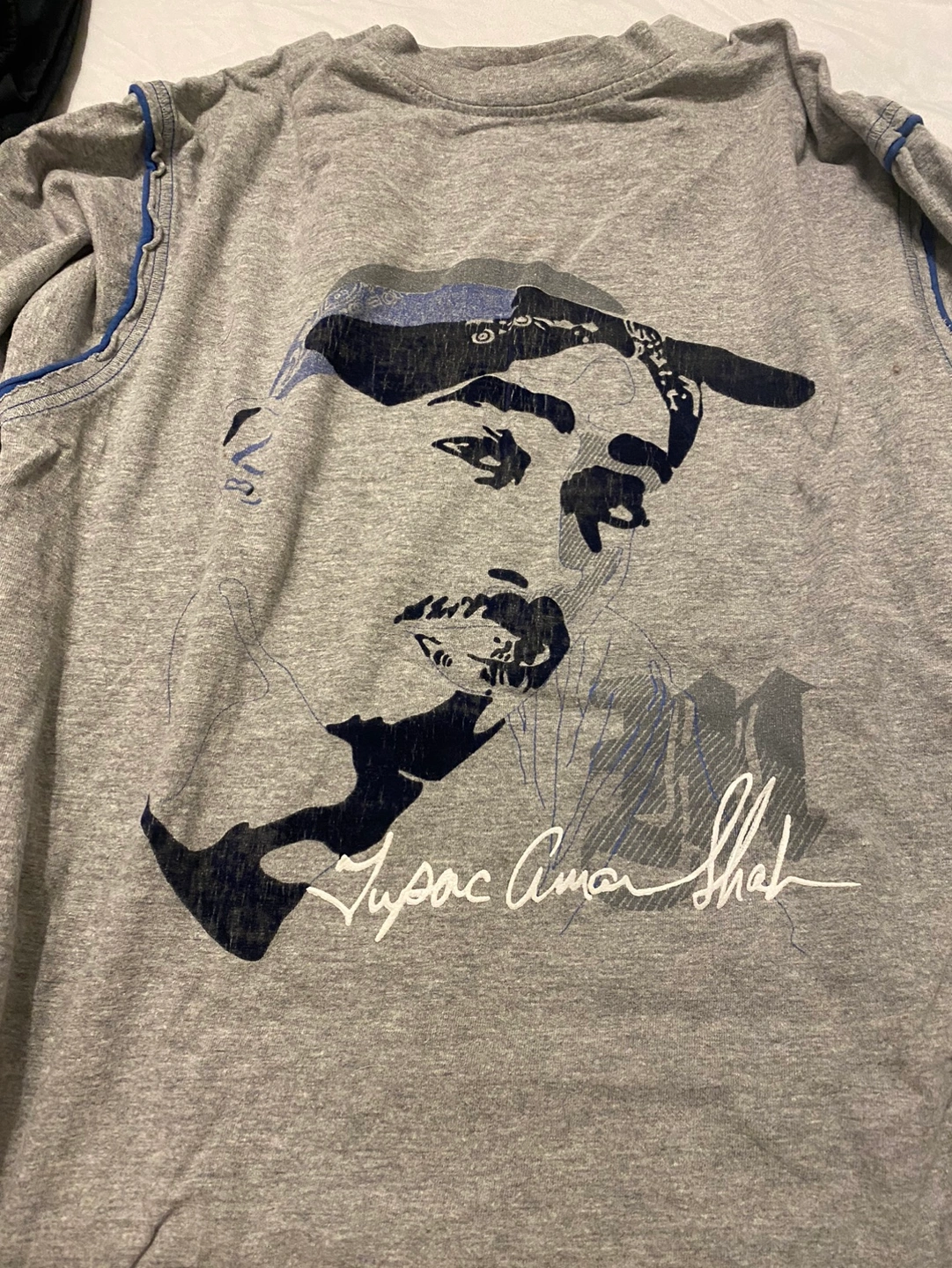 This is a grey t-shirt with a 2Pac Shakur graphic on the back. It has blue accents on the collar and sleeves. It is a size S/M.