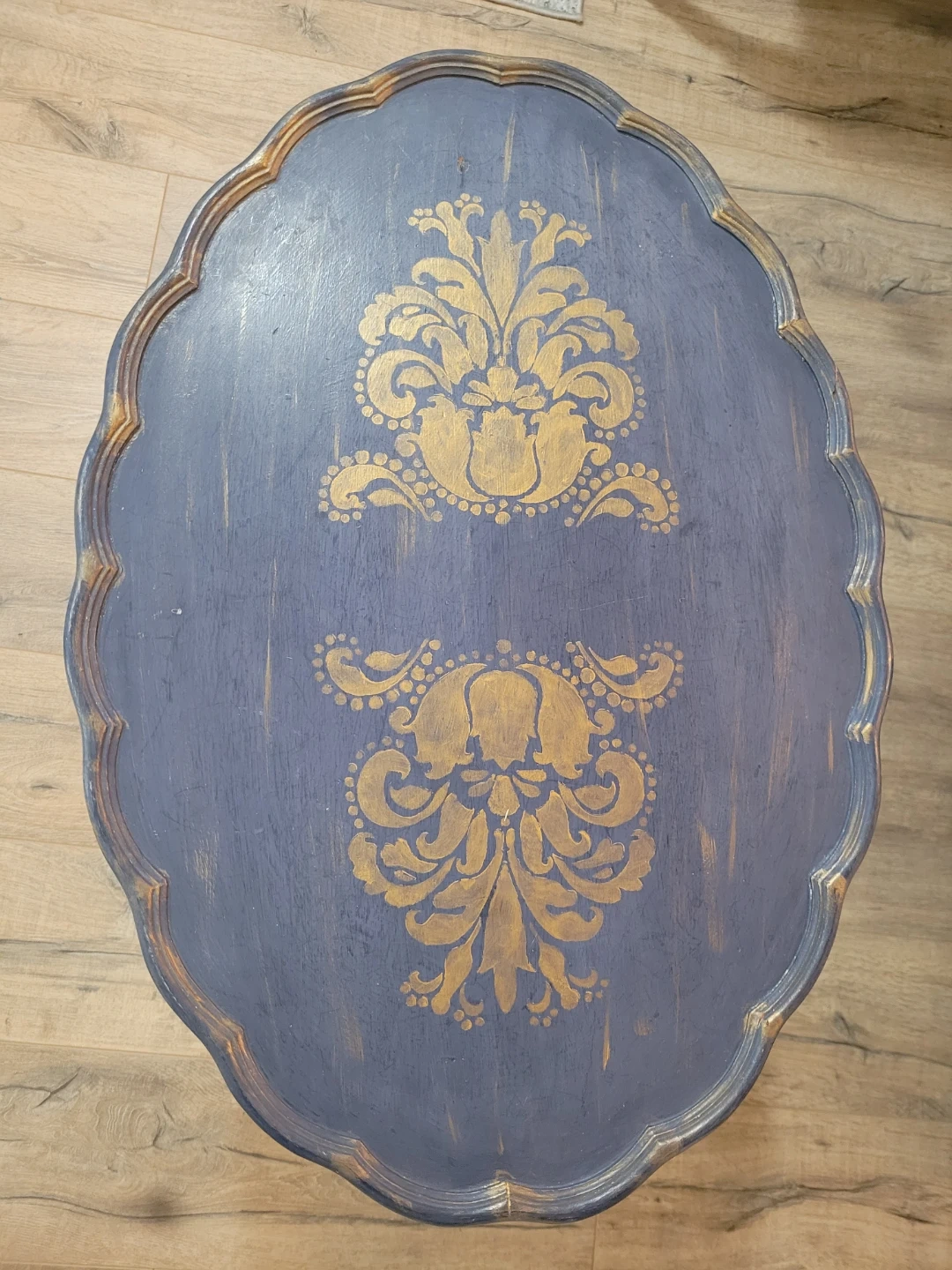 This charming accent table features a scalloped oval top with decorative gold stenciling on a distressed blue finish. Its turned legs with gold tips add a touch of vintage elegance. Perfect for a living room or entryway.