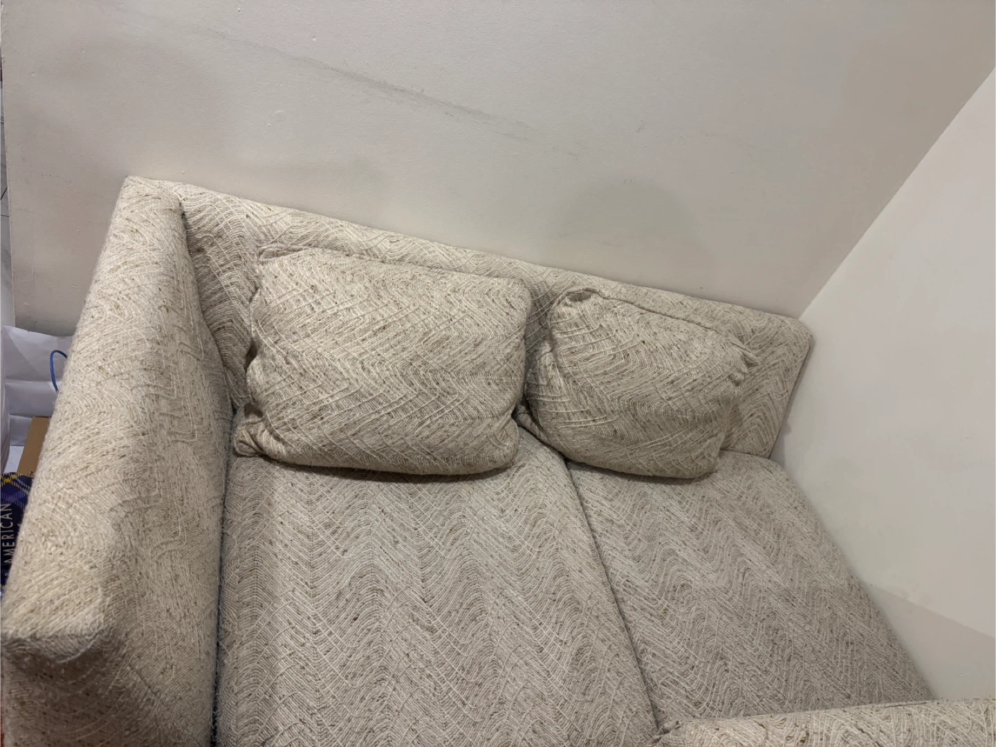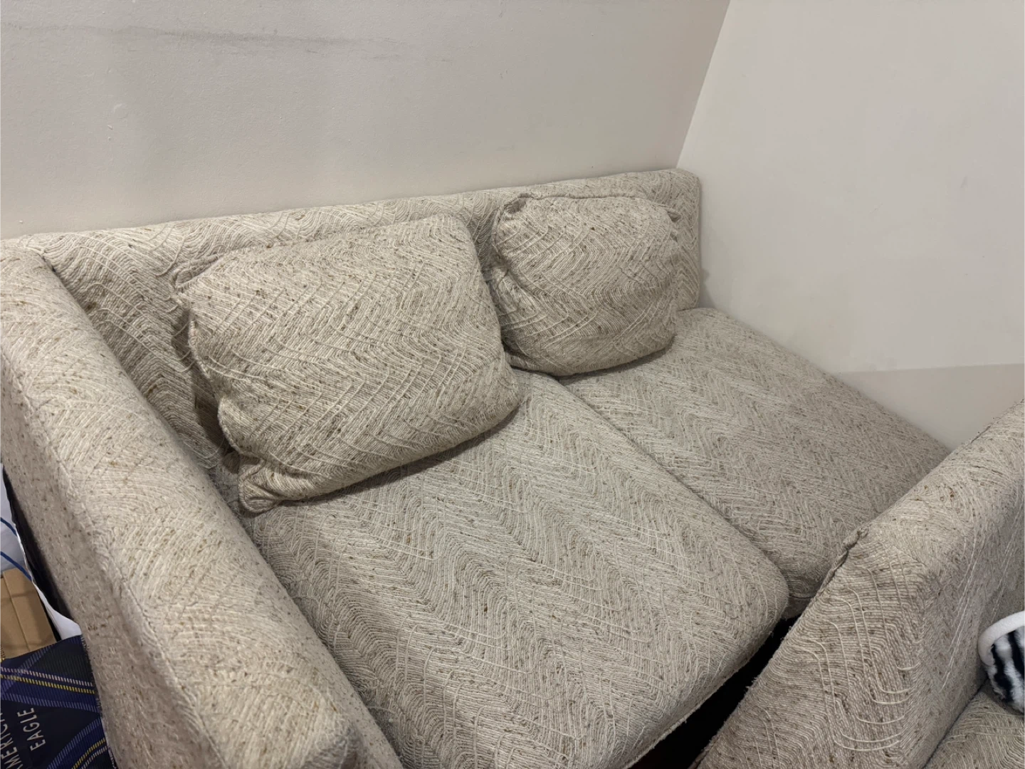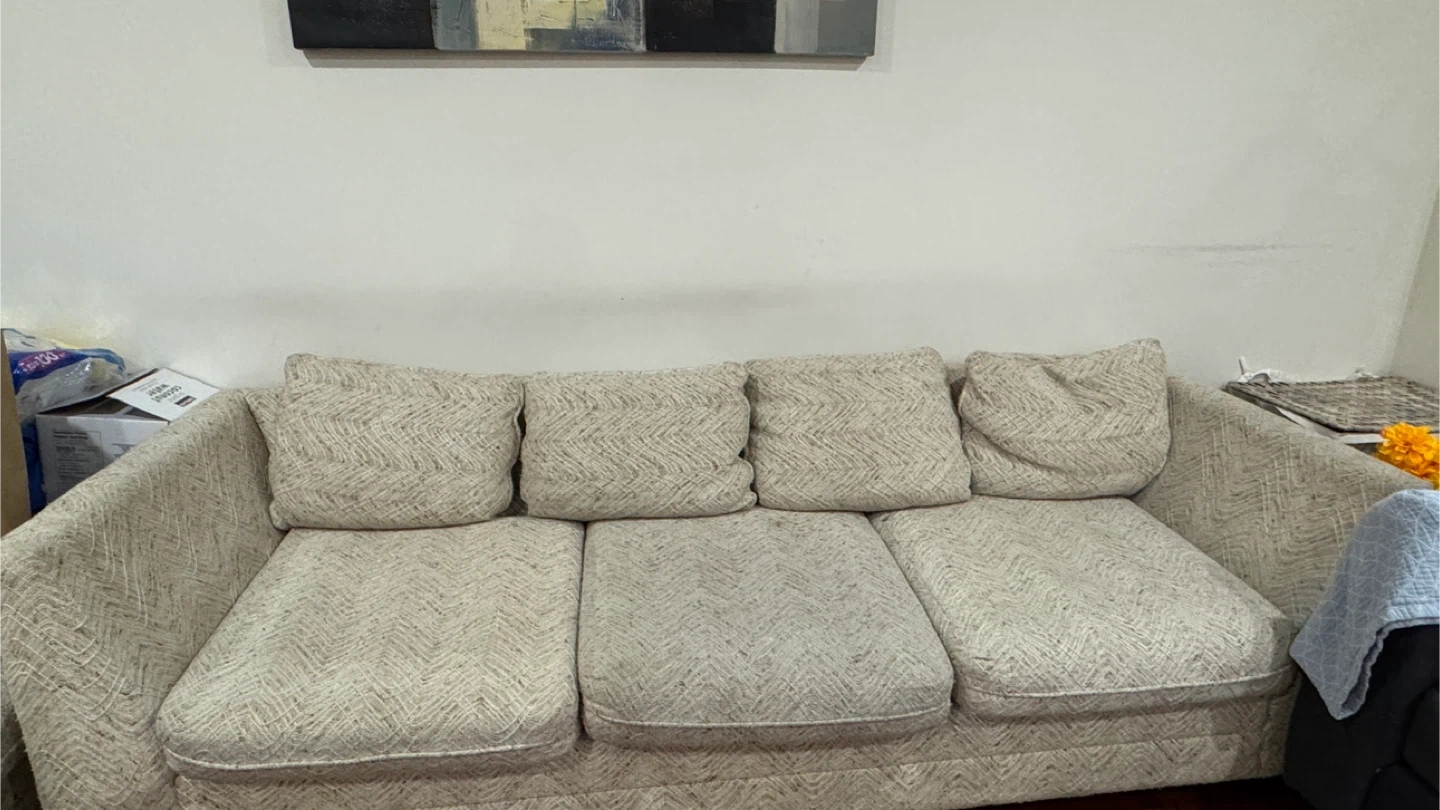 This is a comfy beige sofa with four matching throw pillows. It's upholstered in a textured fabric with a chevron pattern.