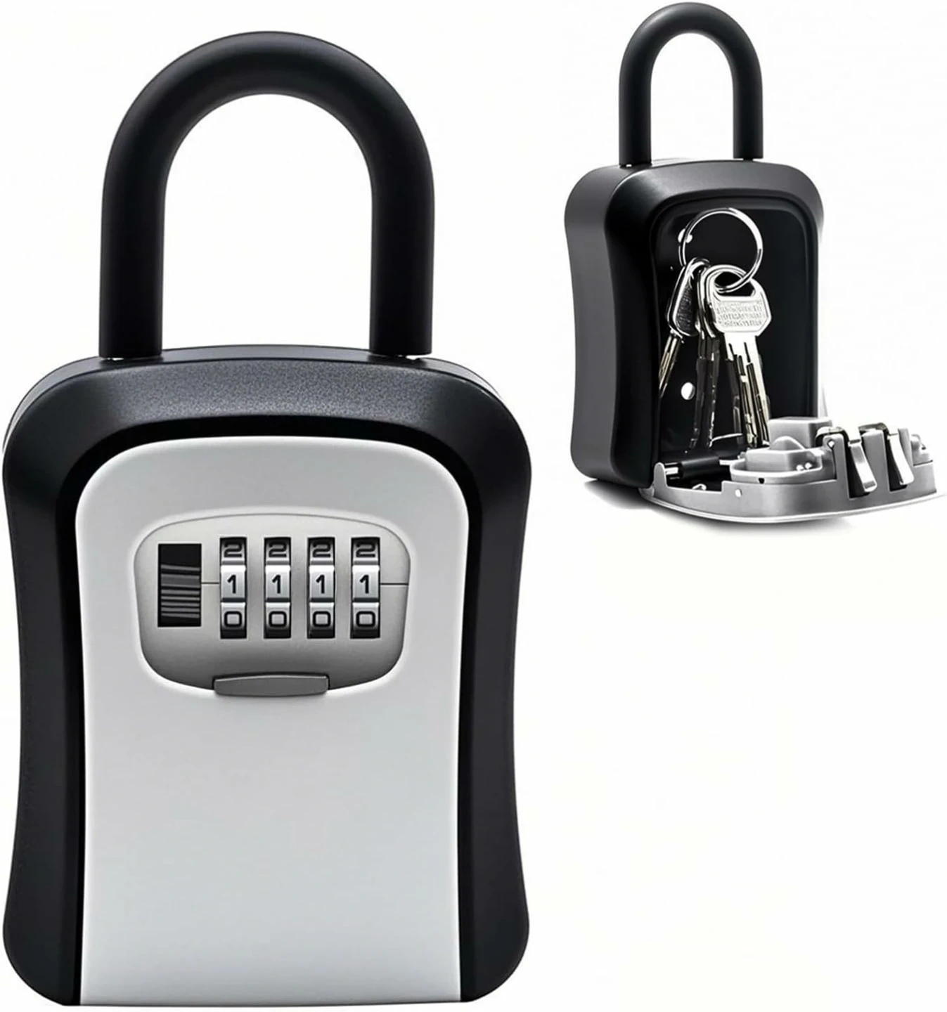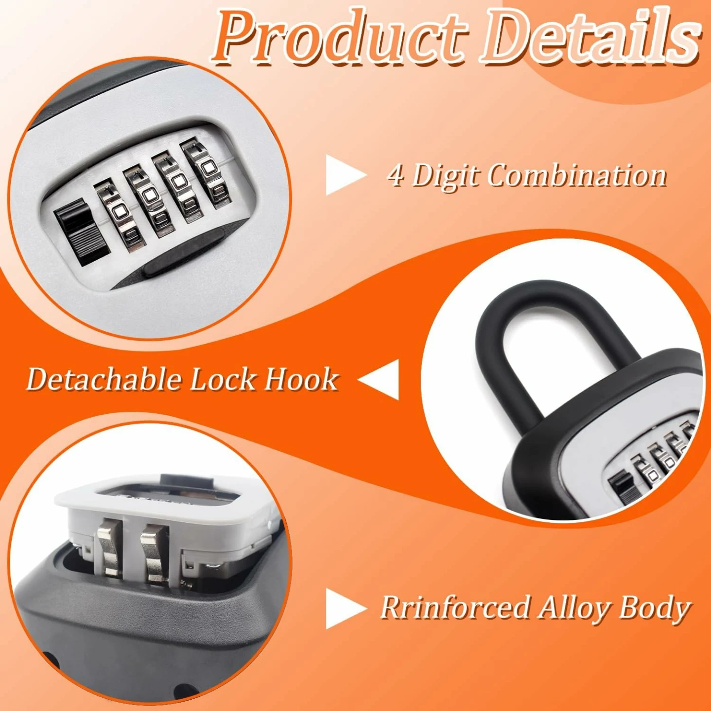 This lock box features a 4-digit combination for secure access. It has a detachable lock hook and a reinforced alloy body. Use it to store keys securely when you can't carry them.