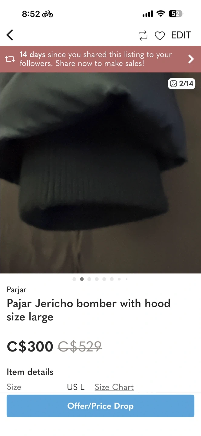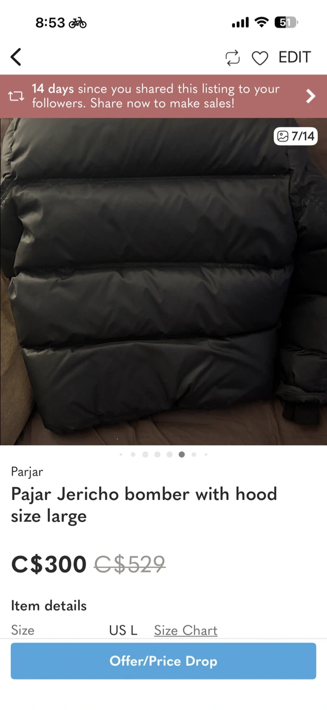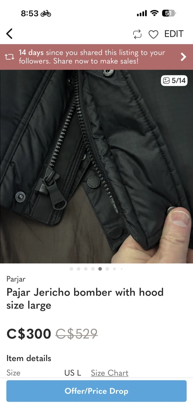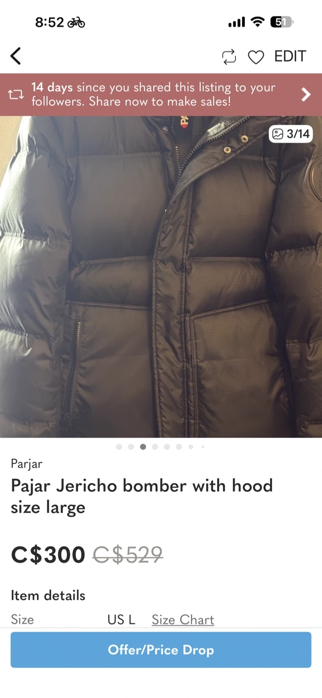 This is a Parjar Pajar Jericho bomber jacket. It's a size large and features a hood. It's black and seems to be made of a puffy material.