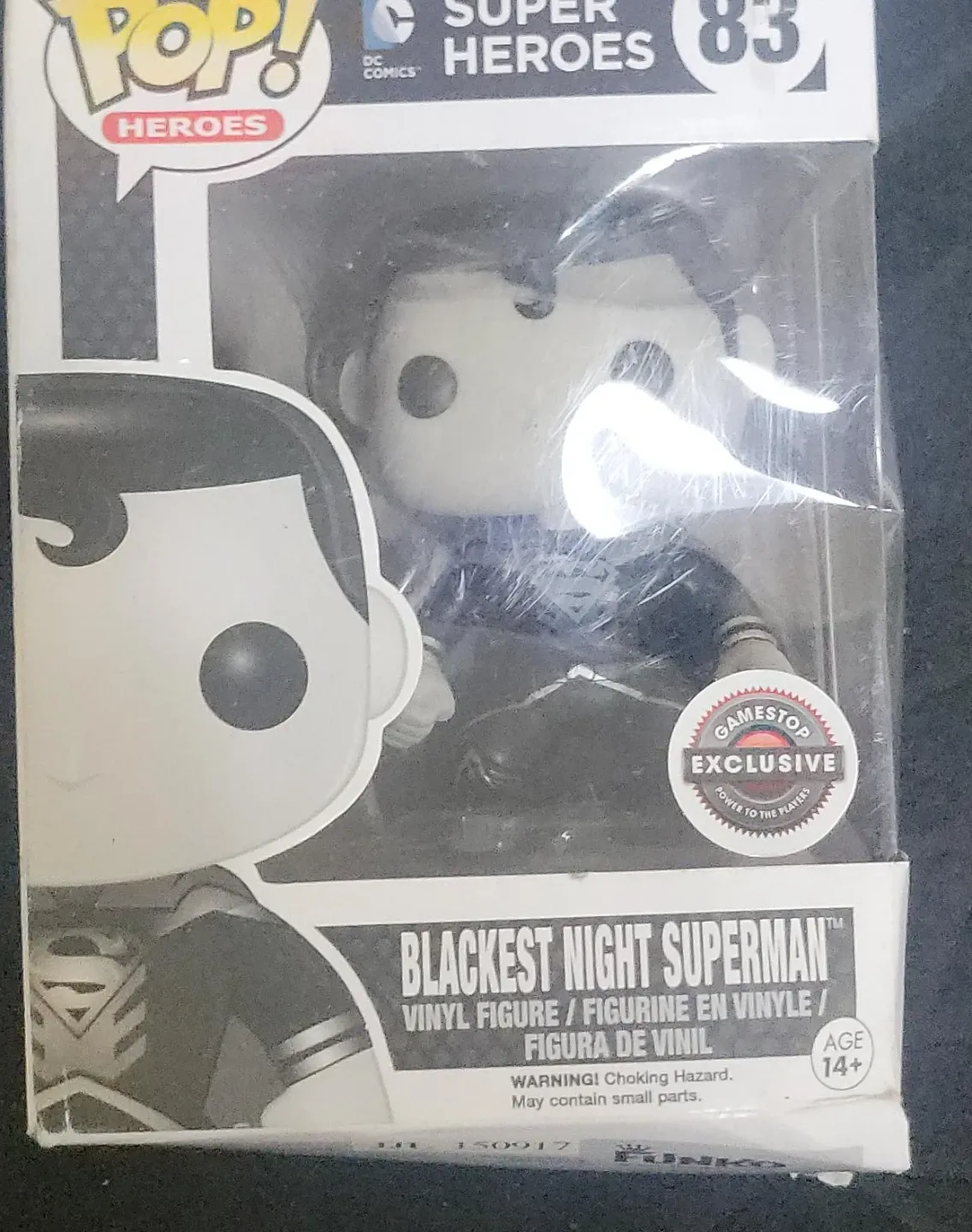 This is a Funko Pop! vinyl figure of Blackest Night Superman, number 83 in the DC Heroes line. It's a GameStop exclusive. Recommended age is 14+. Defective.