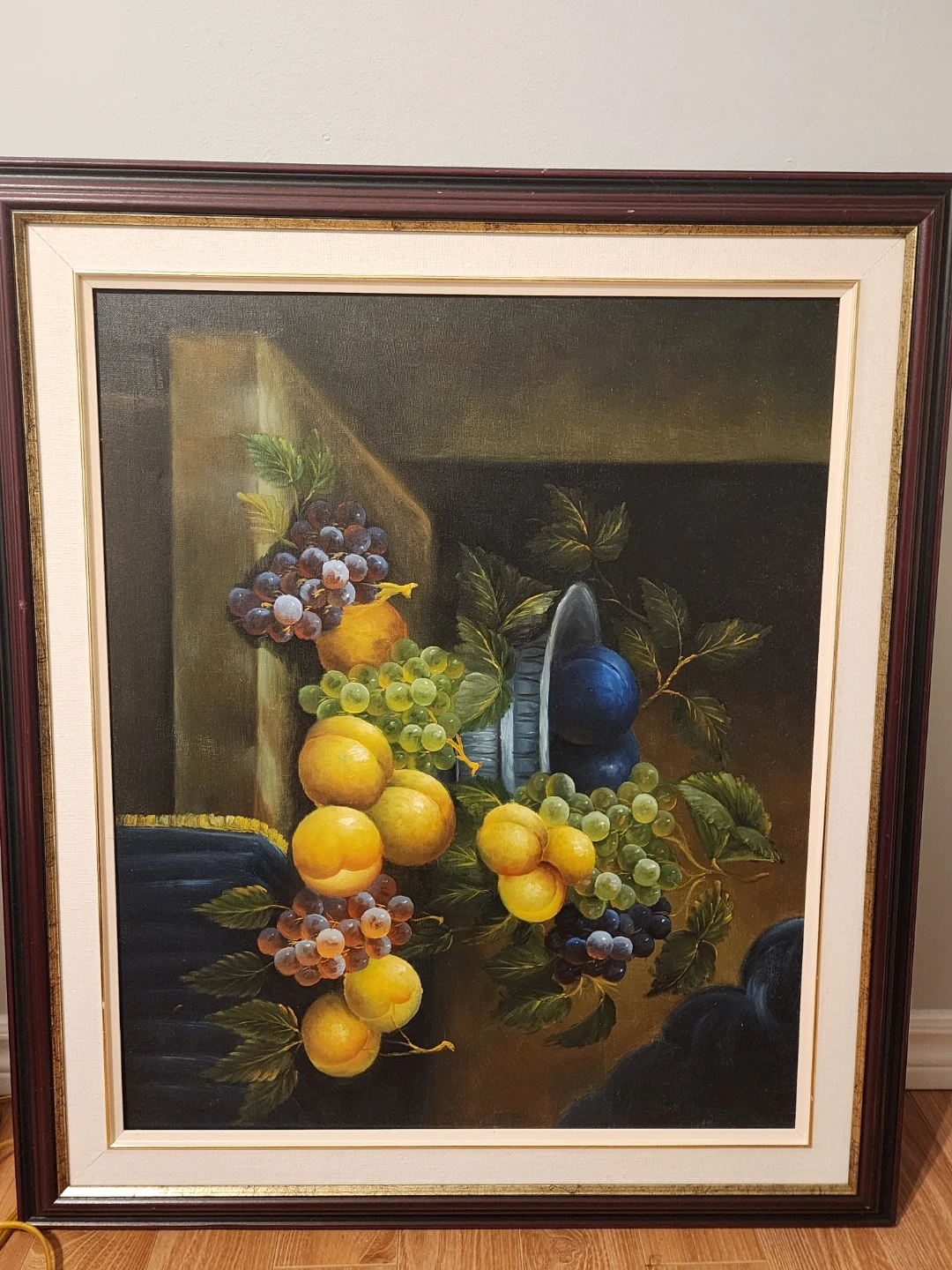 This is a framed oil painting depicting a still life of various fruits, including grapes, plums, and apricots. The artwork is presented in a classic style. It's a lovely piece for any home decor!