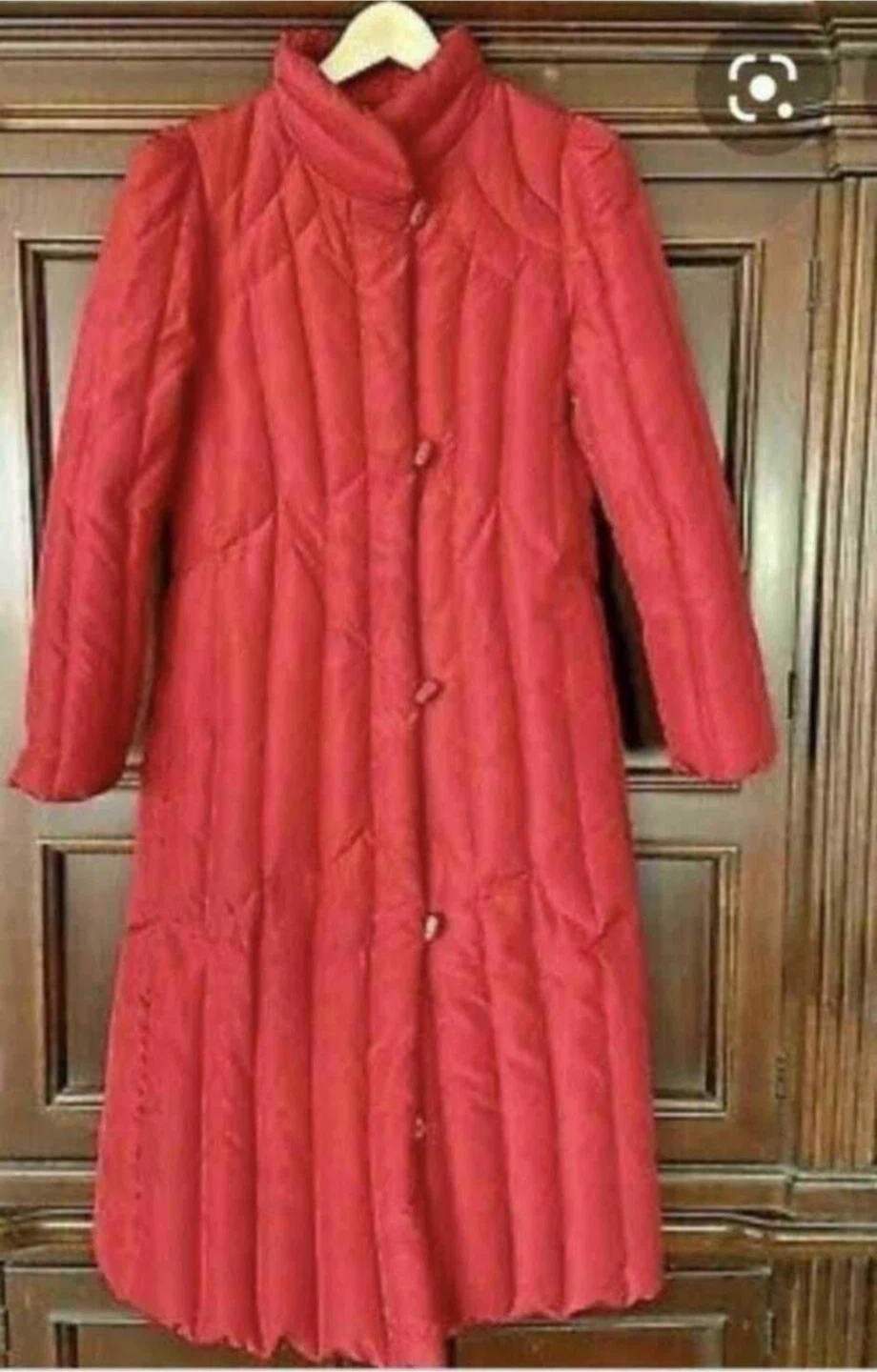 Lovely red puffer down filled long coat, perfect for keeping warm during the colder months! It has a button-up, zippered front and a unique design. Great for adding a pop of colour to your winter wardrobe
