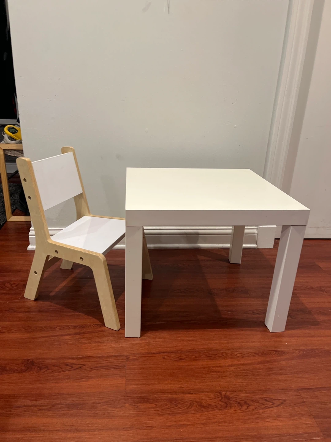 This set includes a white table and a matching chair. It's made with a combination of wood and white laminate for a clean look. It's perfect for your little one's creative space!