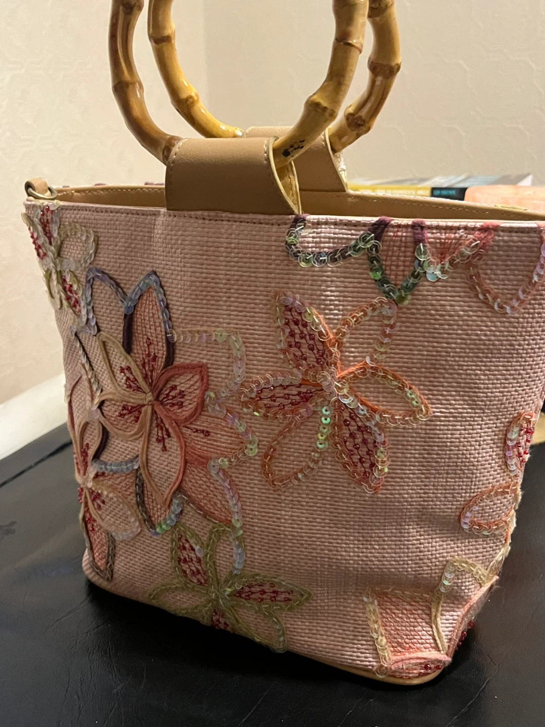 This straw tote bag features a pretty floral embroidery with sequins and classic bamboo handles. It has a zip closure and an interior zippered pocket. Comes with an optional crossbody strap.