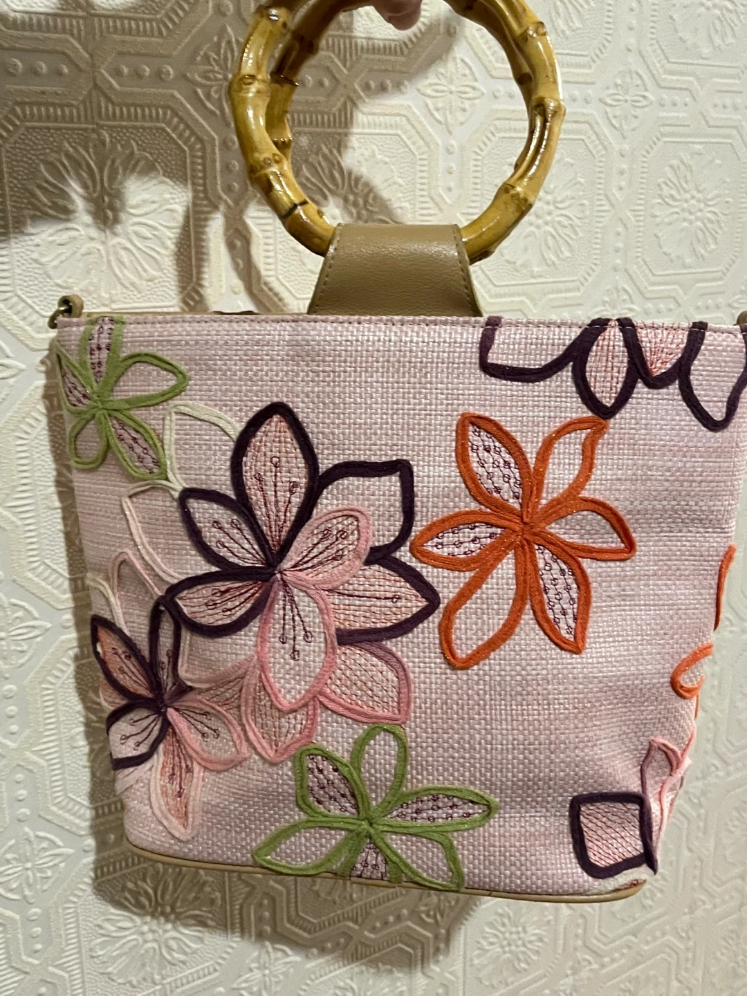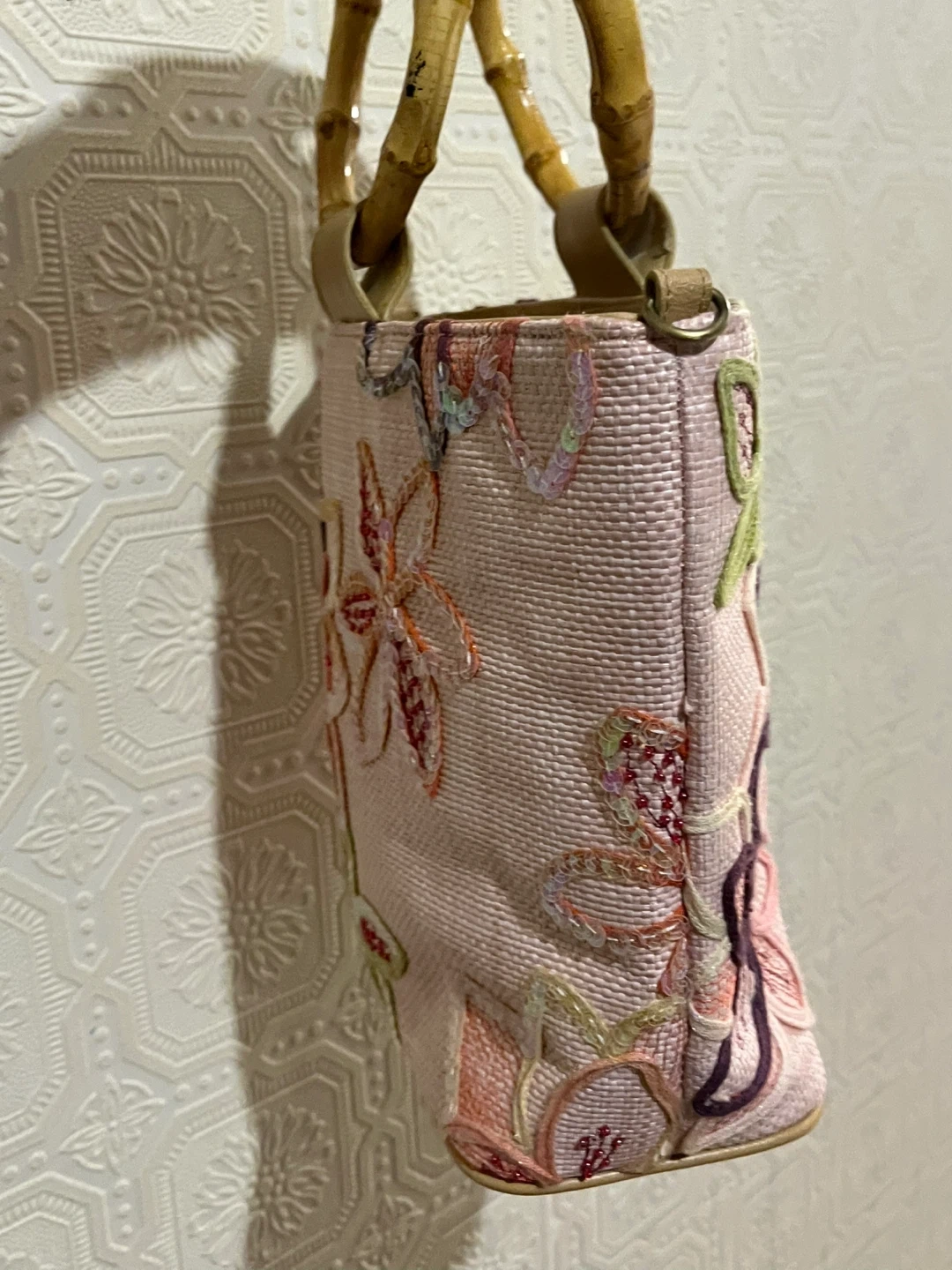 CALIFORNIA Straw Tote Bag Bamboo Handles and Floral Embroidery