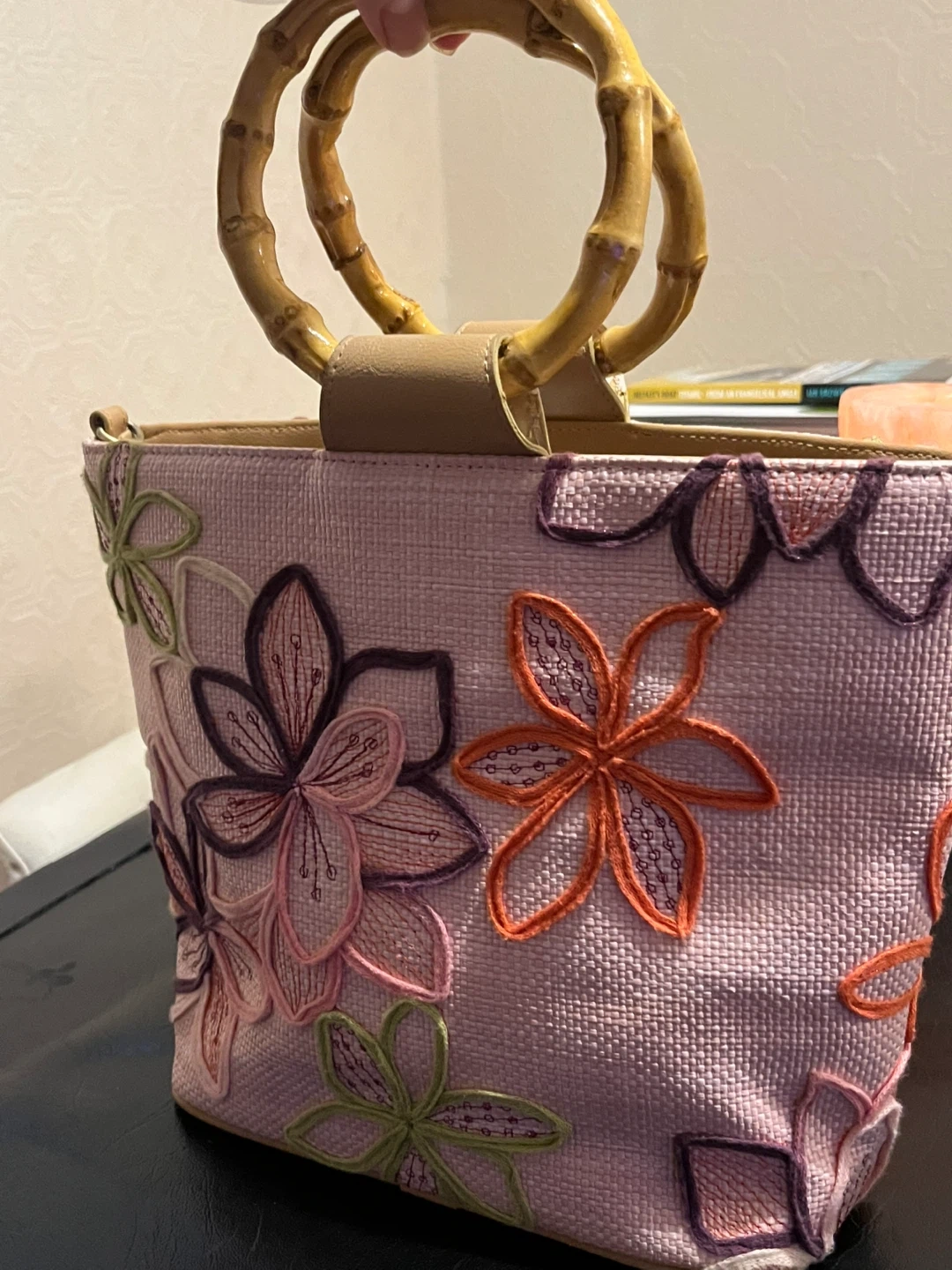 CALIFORNIA Straw Tote Bag Bamboo Handles and Floral Embroidery