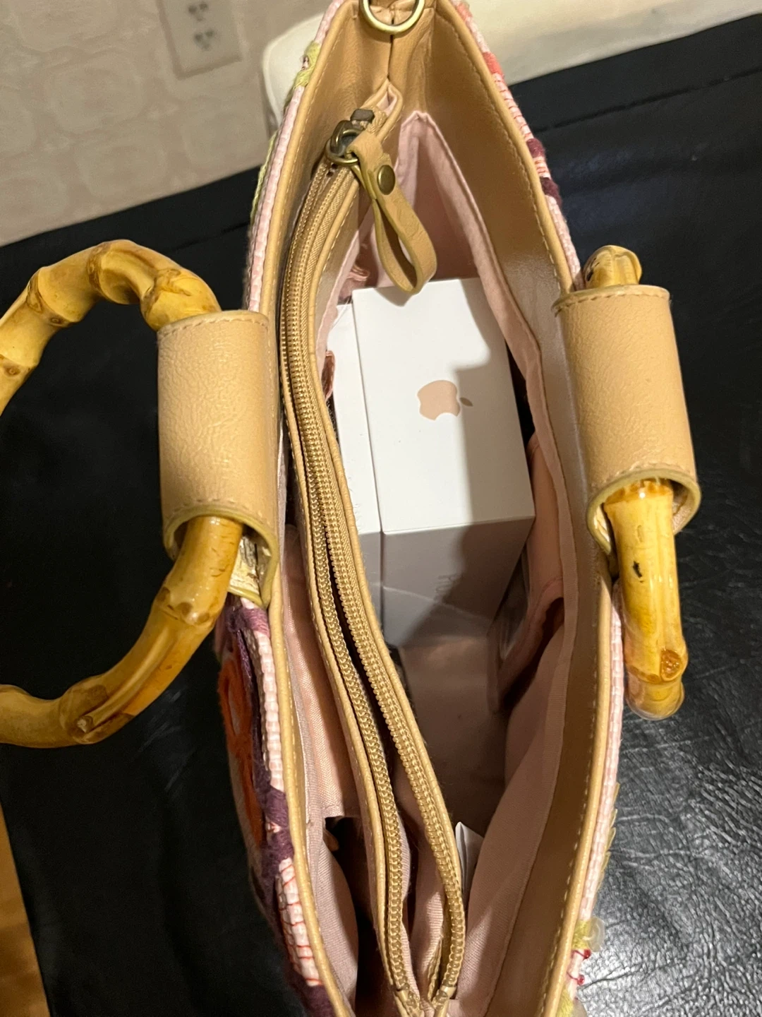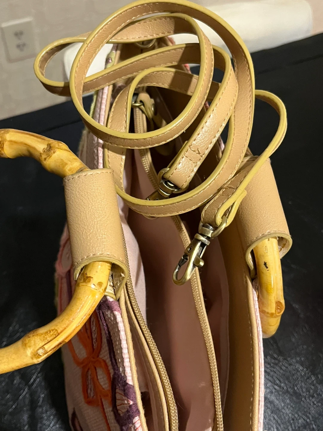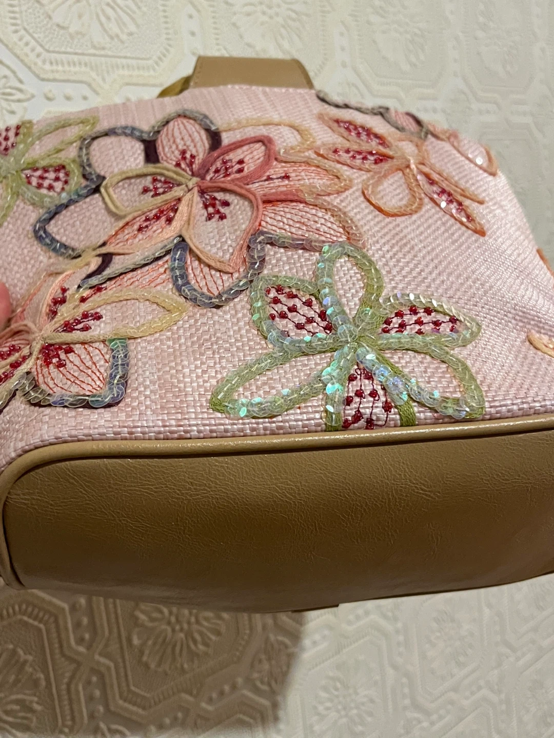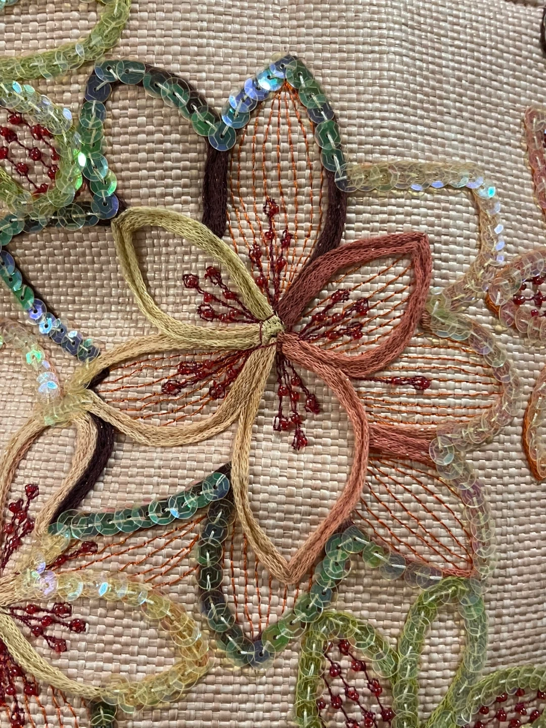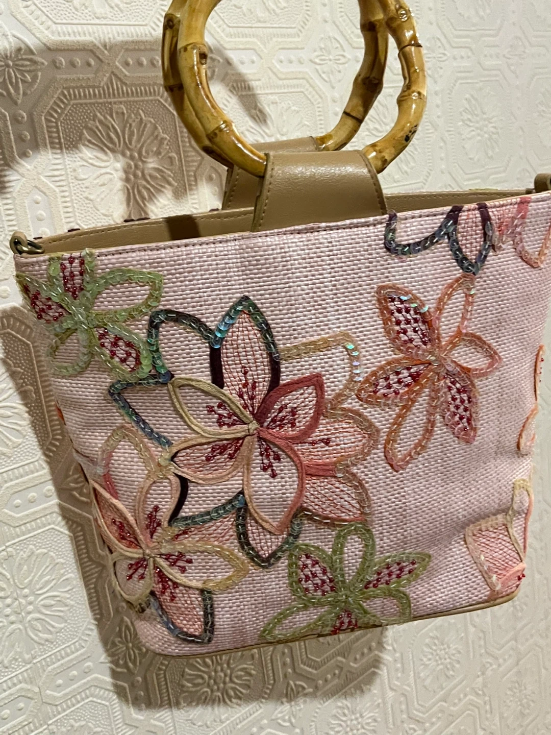 This straw tote bag features a pretty floral embroidery with sequins and classic bamboo handles. It has a zip closure and an interior zippered pocket. Comes with an optional crossbody strap.