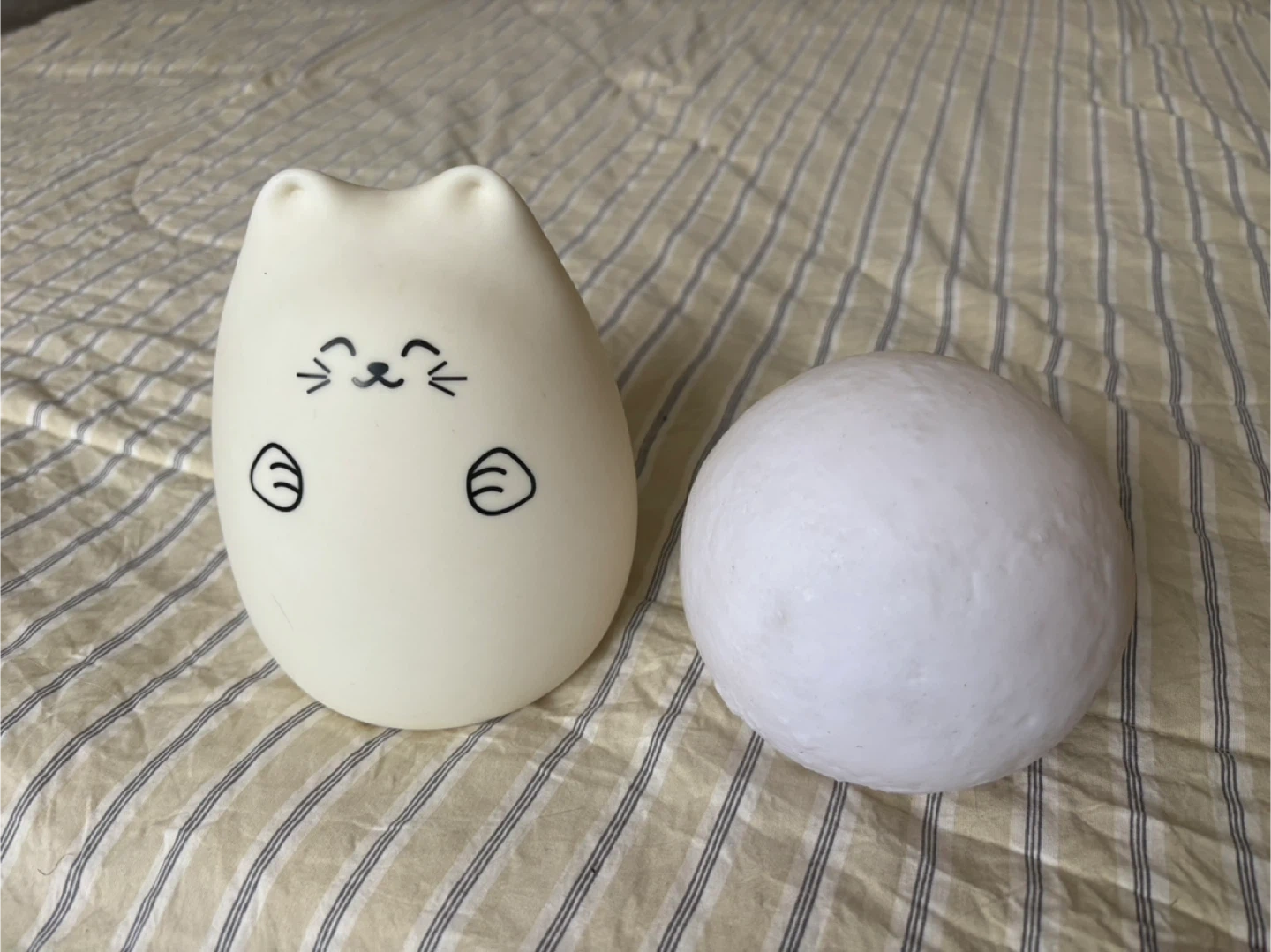 Adorable night lights featuring a kawaii cat design (lights with different colours) and a textured moon (warm light). Very good condition, both working.