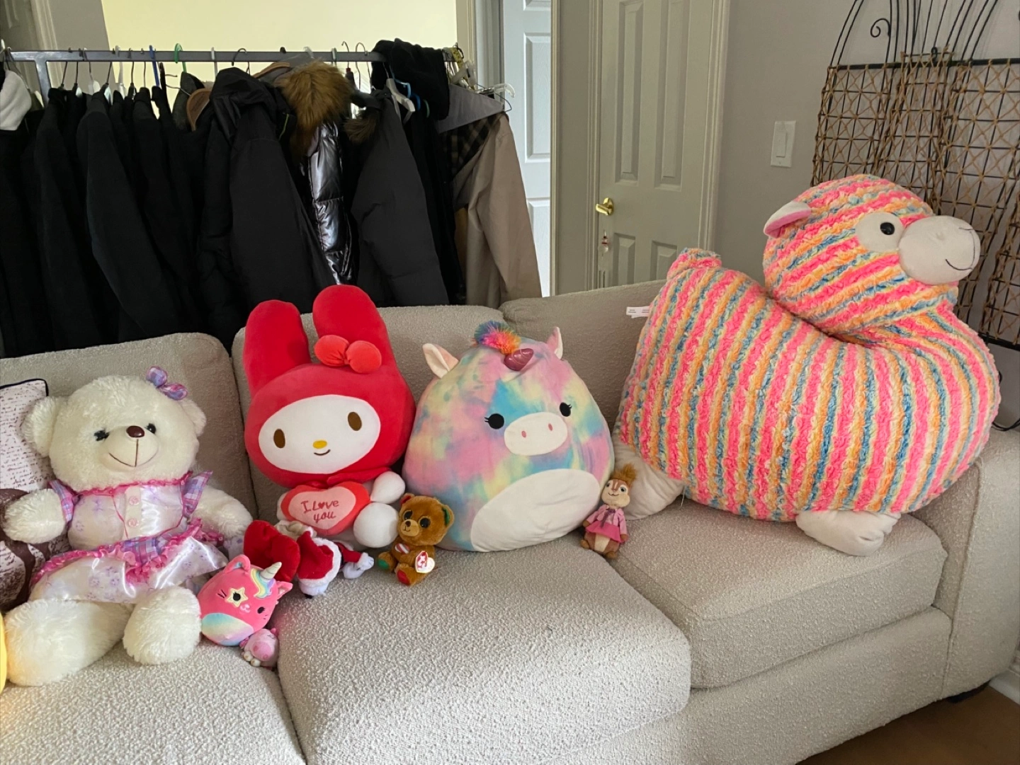 Large size stuffy, A C colourful assortment of stuffed animals. Various sizes and designs, including a large alpaca-like shape. They are perfect for cuddling to unwind after a long day. Large ones for for $20, small ones for $5, all for $50