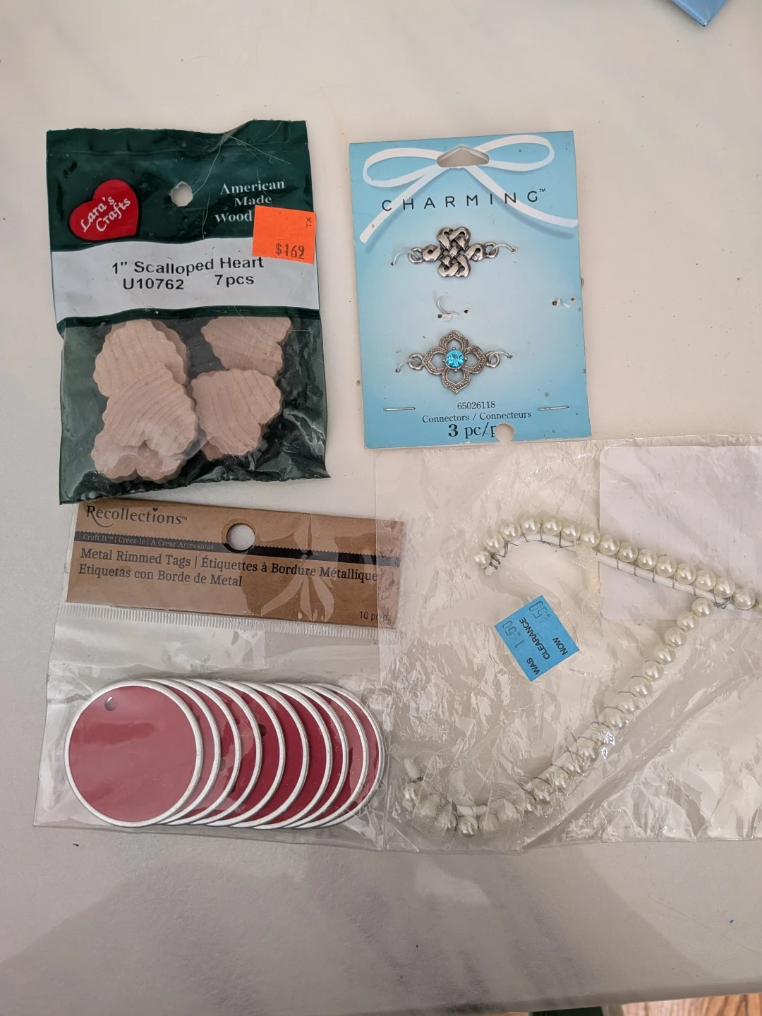Crafting supplies including 7 pieces of 1" scalloped wood hearts and 10 metal-rimmed red tags. Also includes Charming brand connectors and a string of faux pearls. Great for DIY projects!