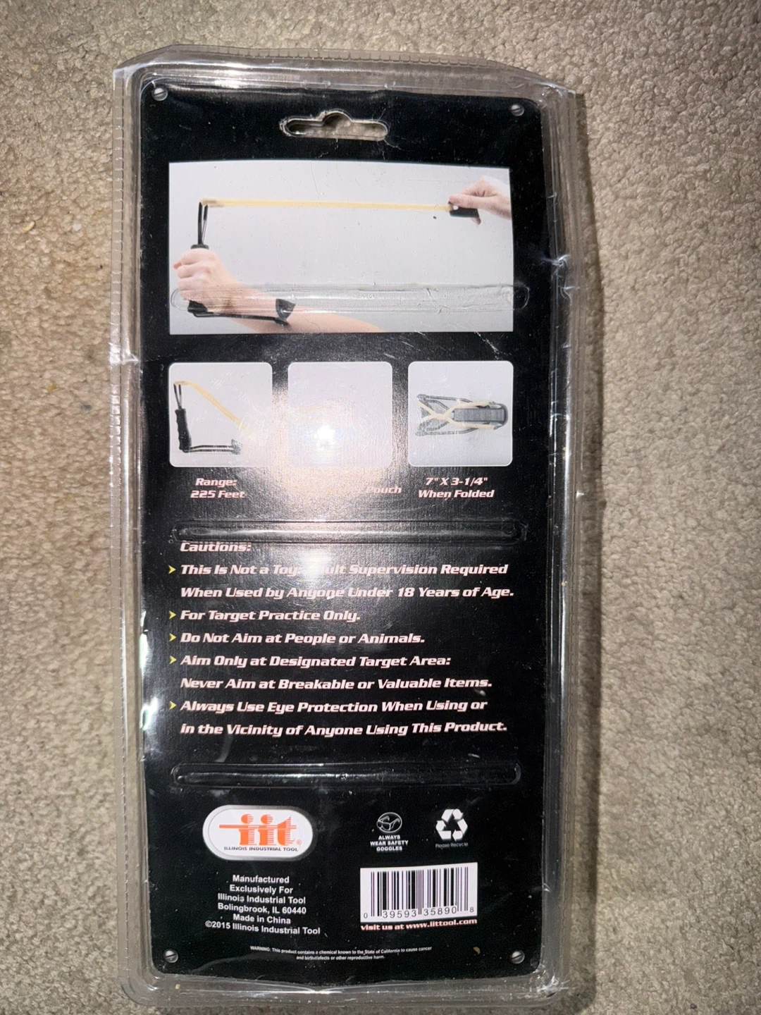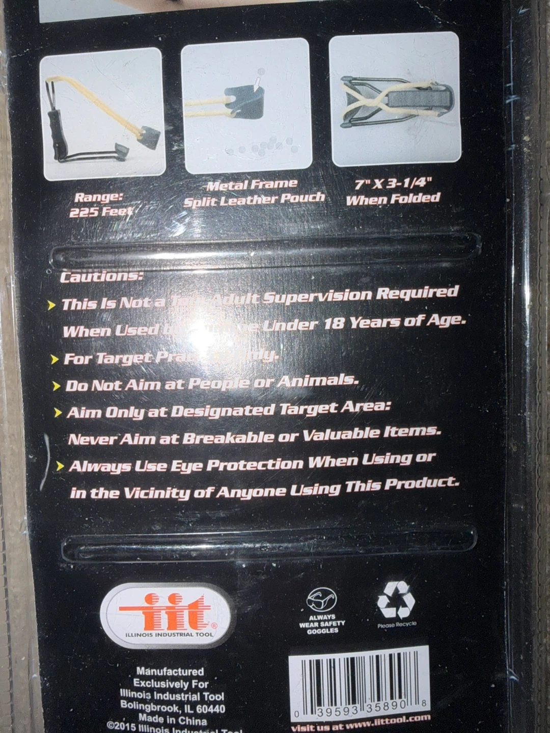 This is a 7 inch slingshot with a metal frame and split leather pouch. It has a range of 225 feet. This is not a toy; adult supervision is required. Aim only at a designated target area.
