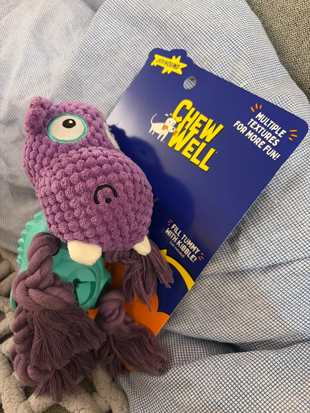This is a Joy Hound Chew Well dog toy! It's a purple hippo with multiple textures for more fun. You can fill its tummy with kibble too!