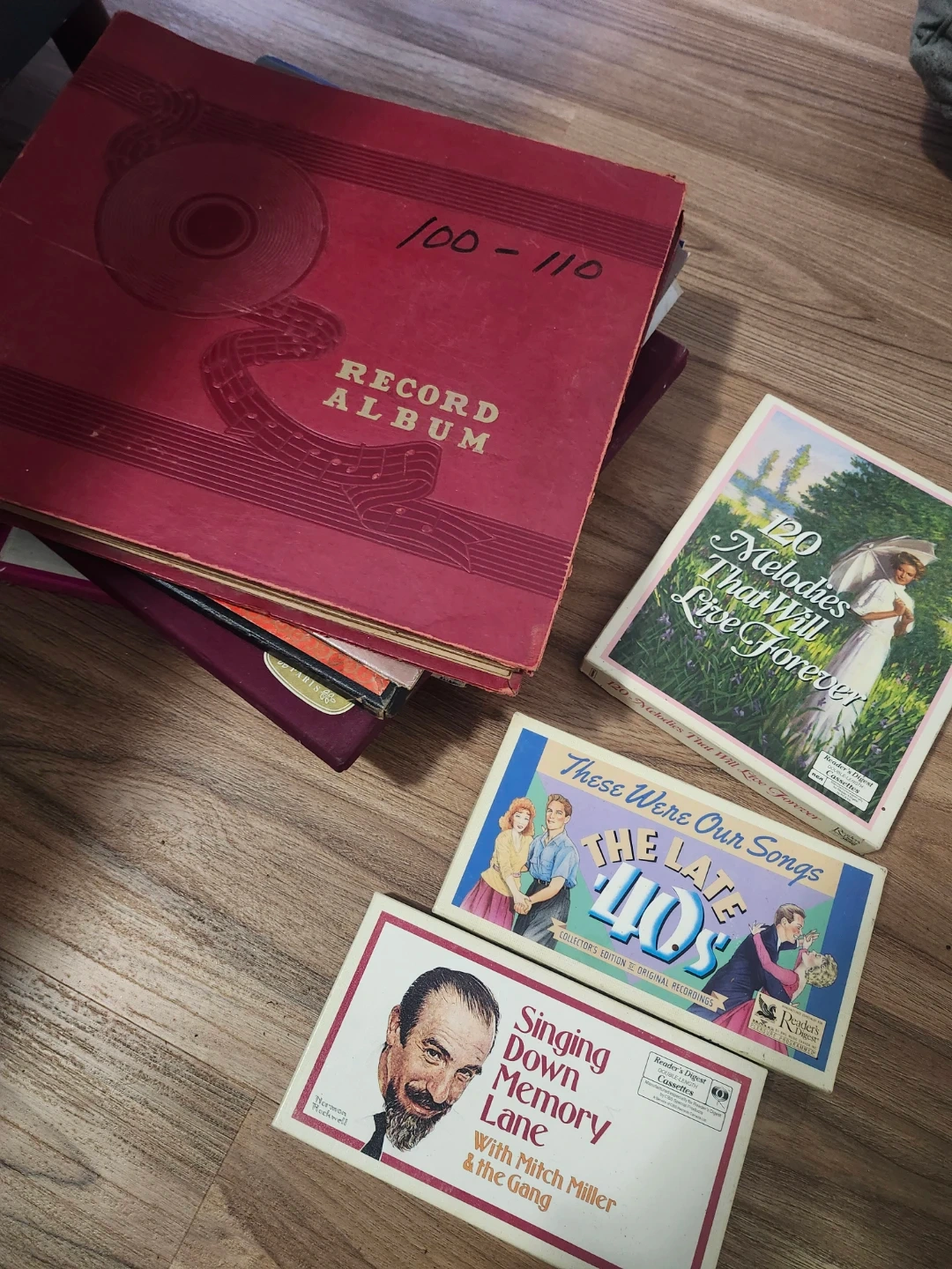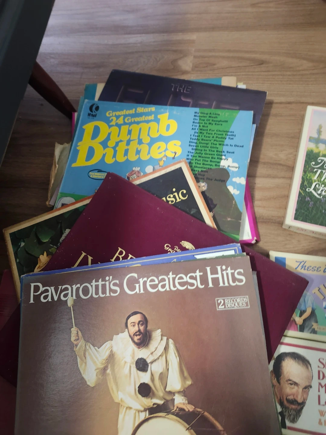Collection of vinyl records including "Dumb Ditties", "These Were Our Songs The Late 40s", "Singing Down Memory Lane", "20 Melodies That Will Live Forever", and "Pavarotti's Greatest Hits". These records offer a variety of music genres and eras. They're perfect for a music enthusiast's collection.