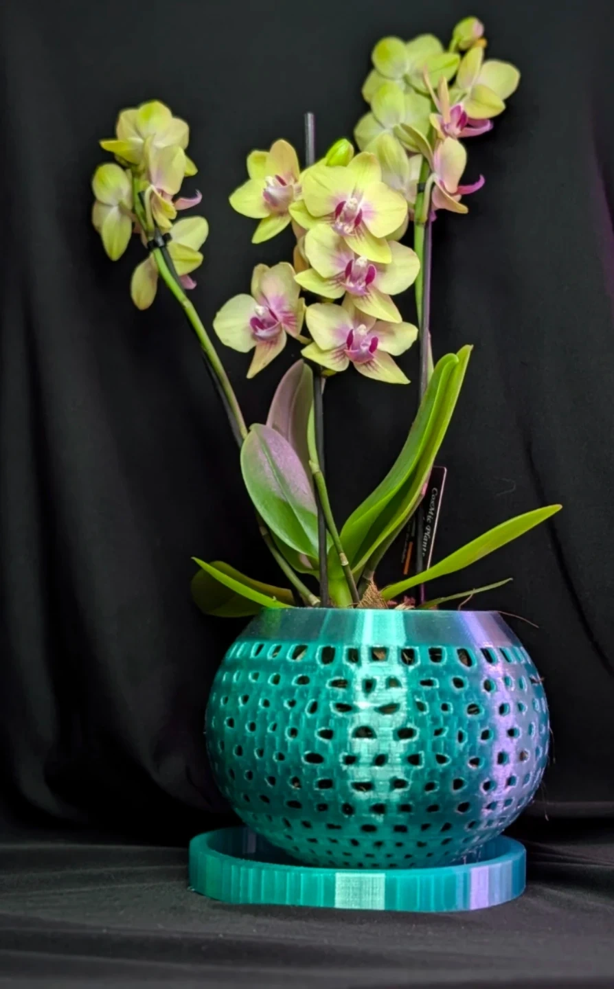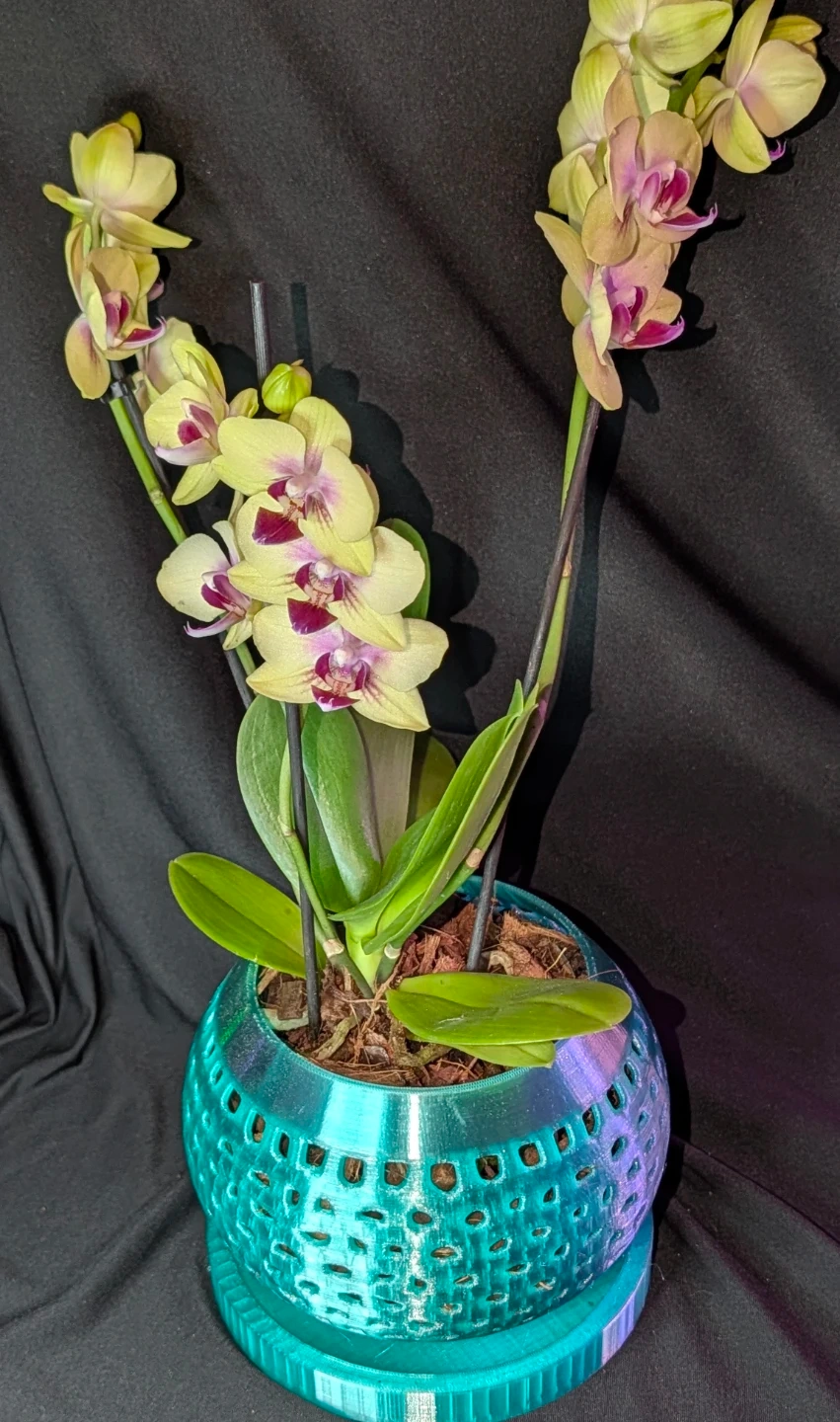 Handmade 3D printed orchid pot with matching tray. Designed with airflow openings to give your orchid a stylish, modern home. Available in different colors to match your decor.