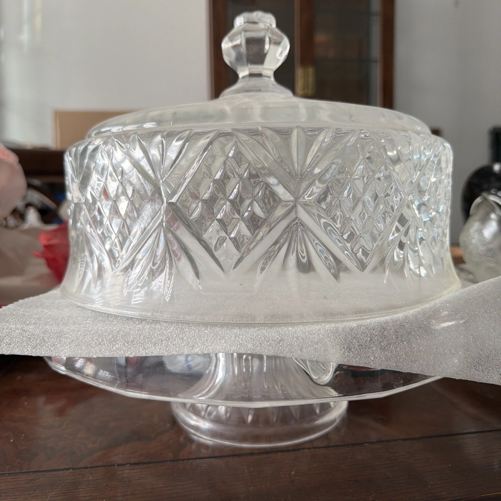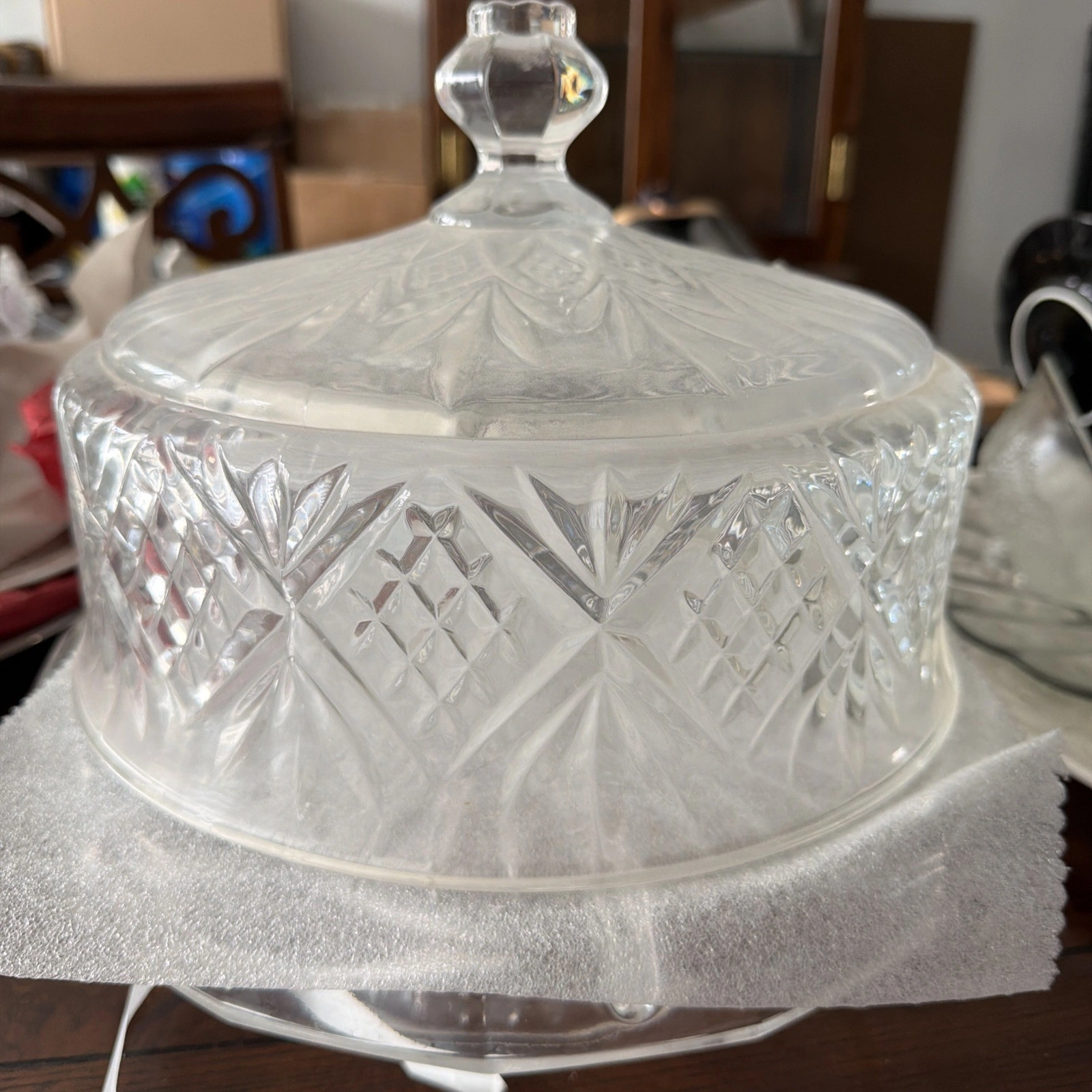 This is a used Godinger Dublin Crystal cake stand with a dome cover. It's clear, round, and measures 12 inches in diameter and 10 inches in height. Made in 2003, it's perfect for all occasions. Let me know if you're interested!