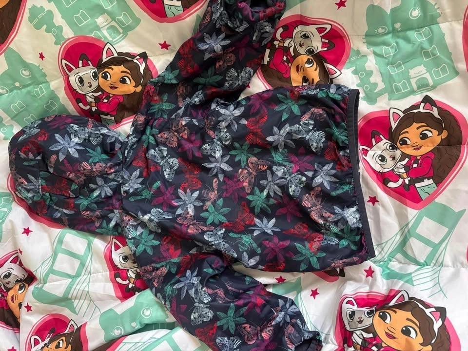 Cozy Columbia kids jacket with a cool floral pattern in red, green, and purple. It's dark blue/black with a white zipper and is super warm with fleece lining inside. Great for playing outside.
