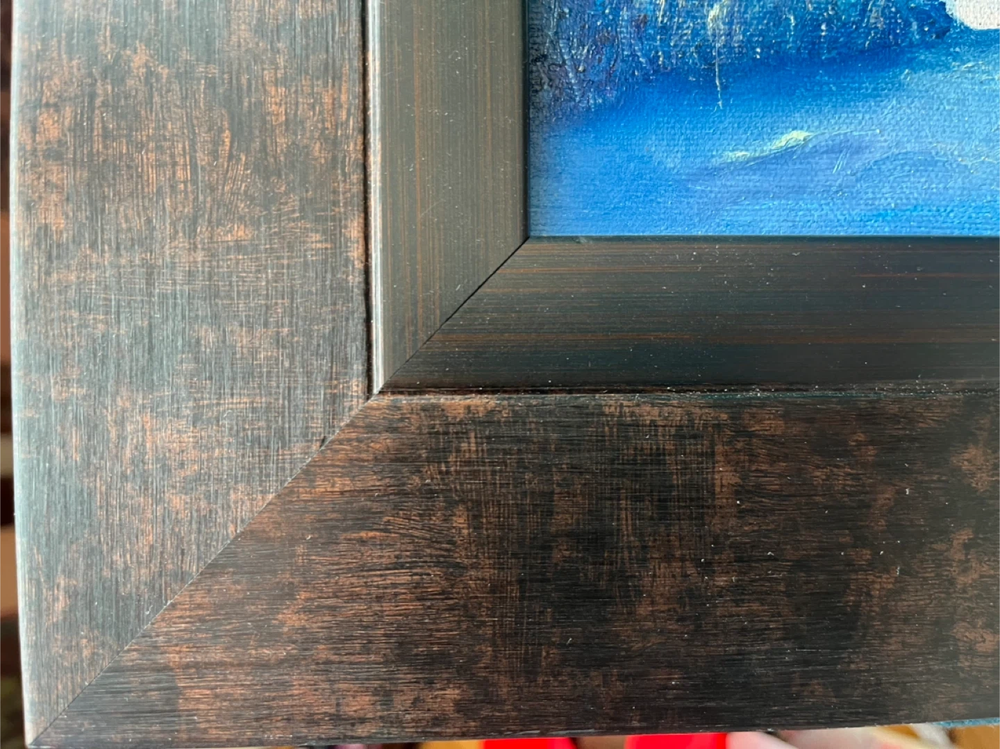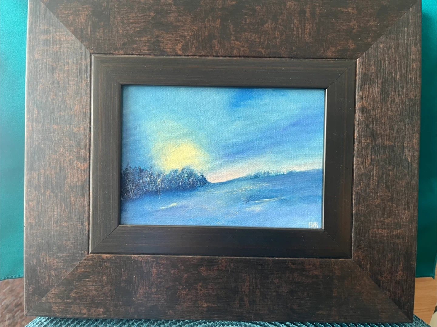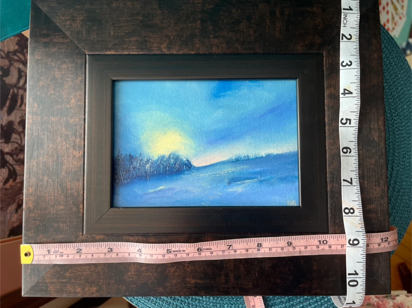 “Prairie Winter Dawn”, 5x7, oil on canvas, by a local artist (the seller). Framed to 10x12 in a rich brown faux wood frame.