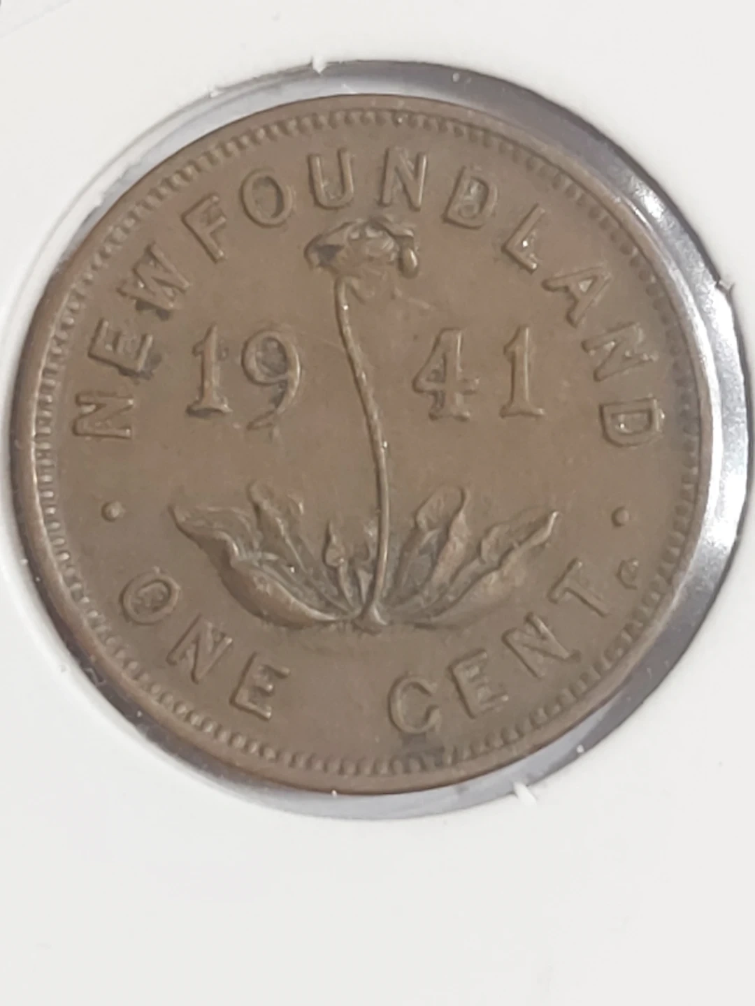 This is a 1941 Newfoundland 1 cent coin. It features King George VI on one side and a plant design on the other. A neat piece for collectors!