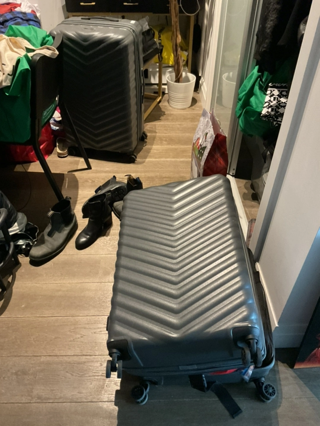Hard-shell suitcase, grey colour. Features a unique chevron pattern. Checked bag. I have 2 if interested!