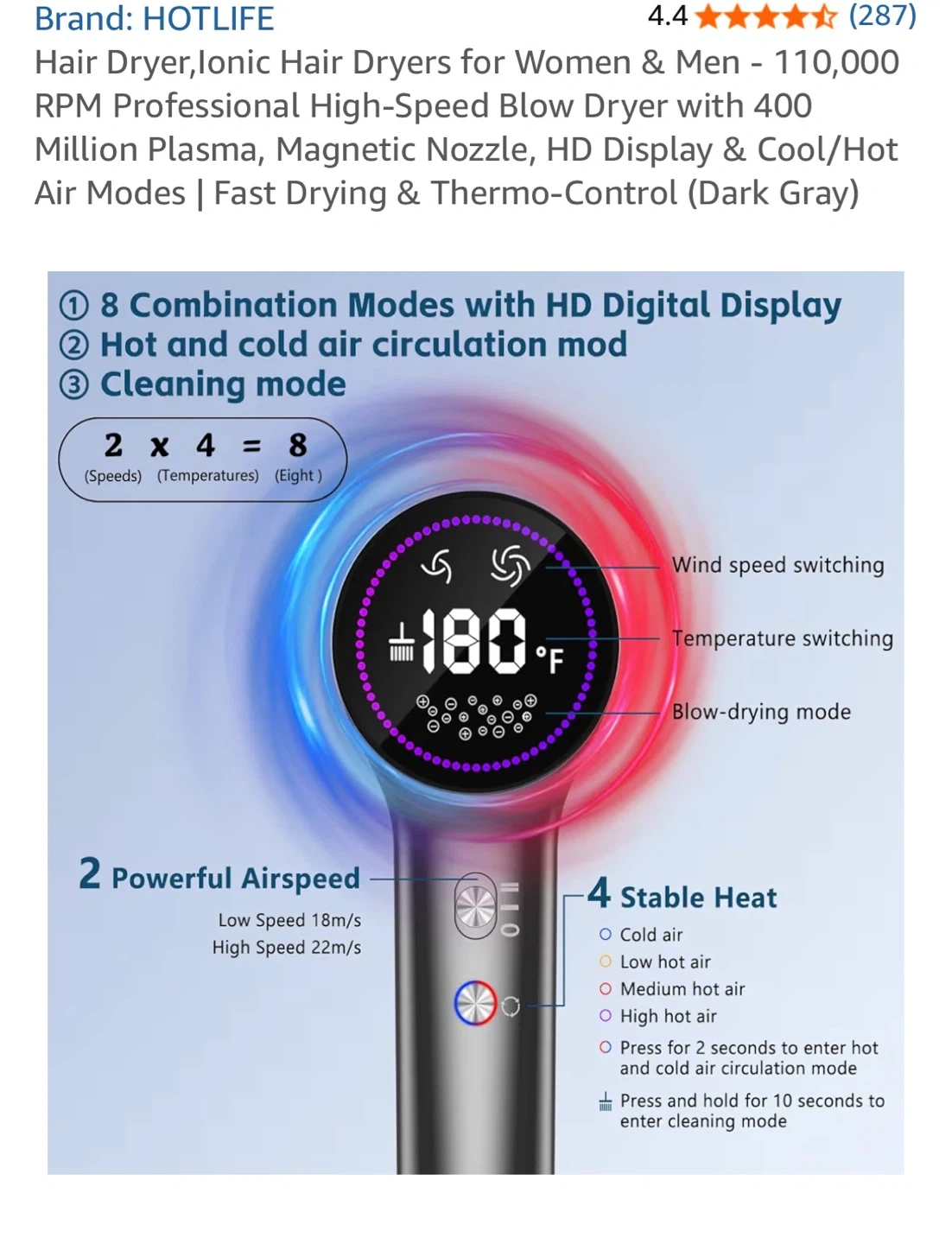 This hair dryer comes in a dark gray colour. It features 8 combination modes with an HD digital display and 2 powerful airspeeds. It offers 4 stable heat settings for customizable drying.