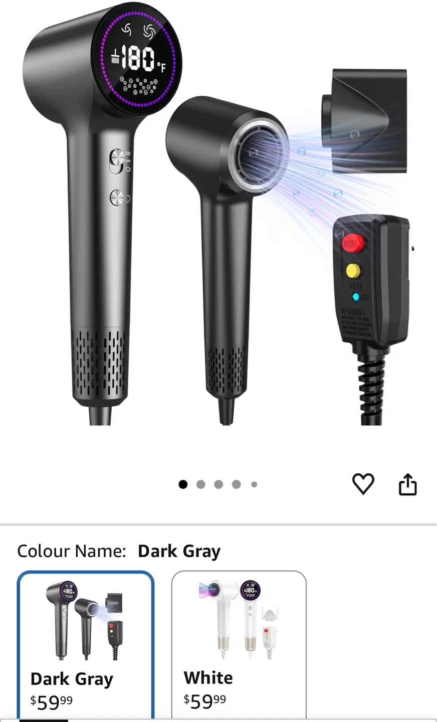 This hair dryer comes in a dark gray colour. It features 8 combination modes with an HD digital display and 2 powerful airspeeds. It offers 4 stable heat settings for customizable drying.