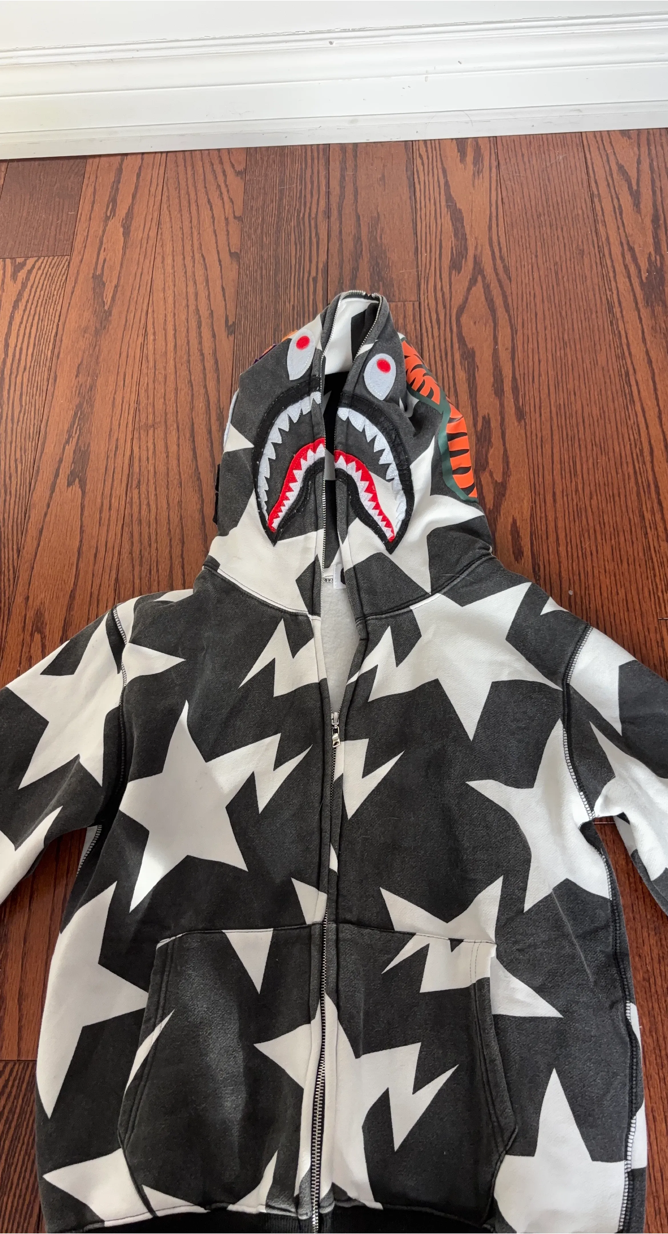 This BAPE hoodie features the iconic shark graphic on the hood. It has a black and white star print all over. It's a full-zip style with front pockets. Made from a soft fabric blend for comfort.