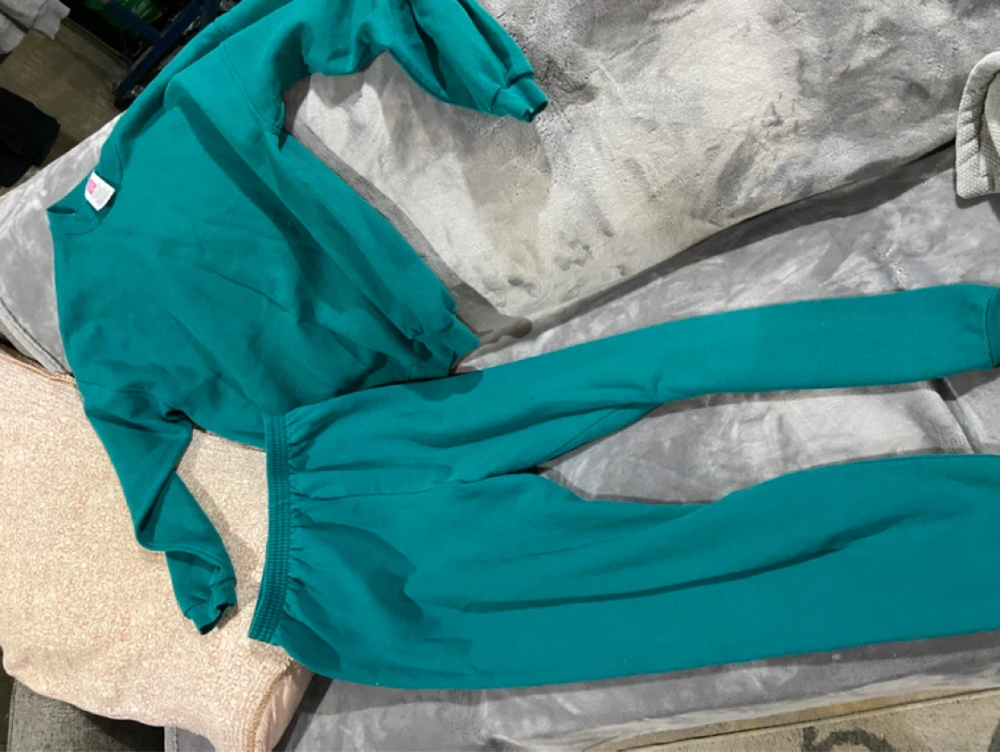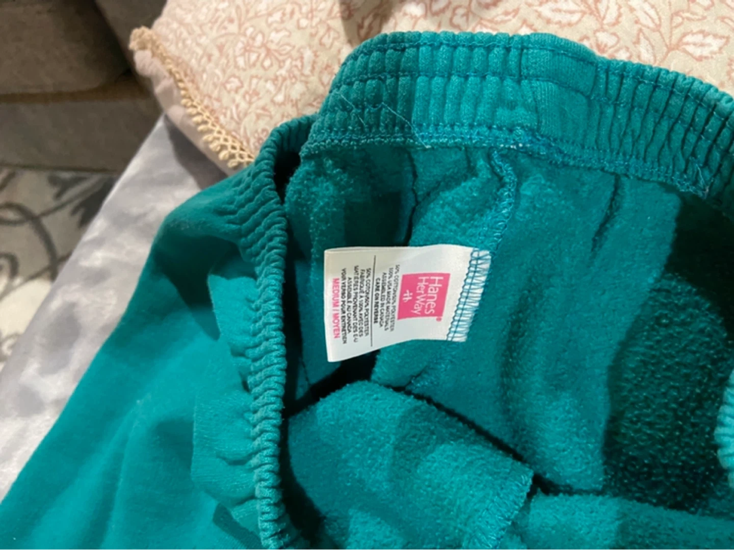 This Hanes Her Way sweatshirt and matching pants set is teal. It's made from a 50% cotton, 50% polyester blend. The sweatshirt is size large, and the pants are size medium. Asking 15 obo vintage