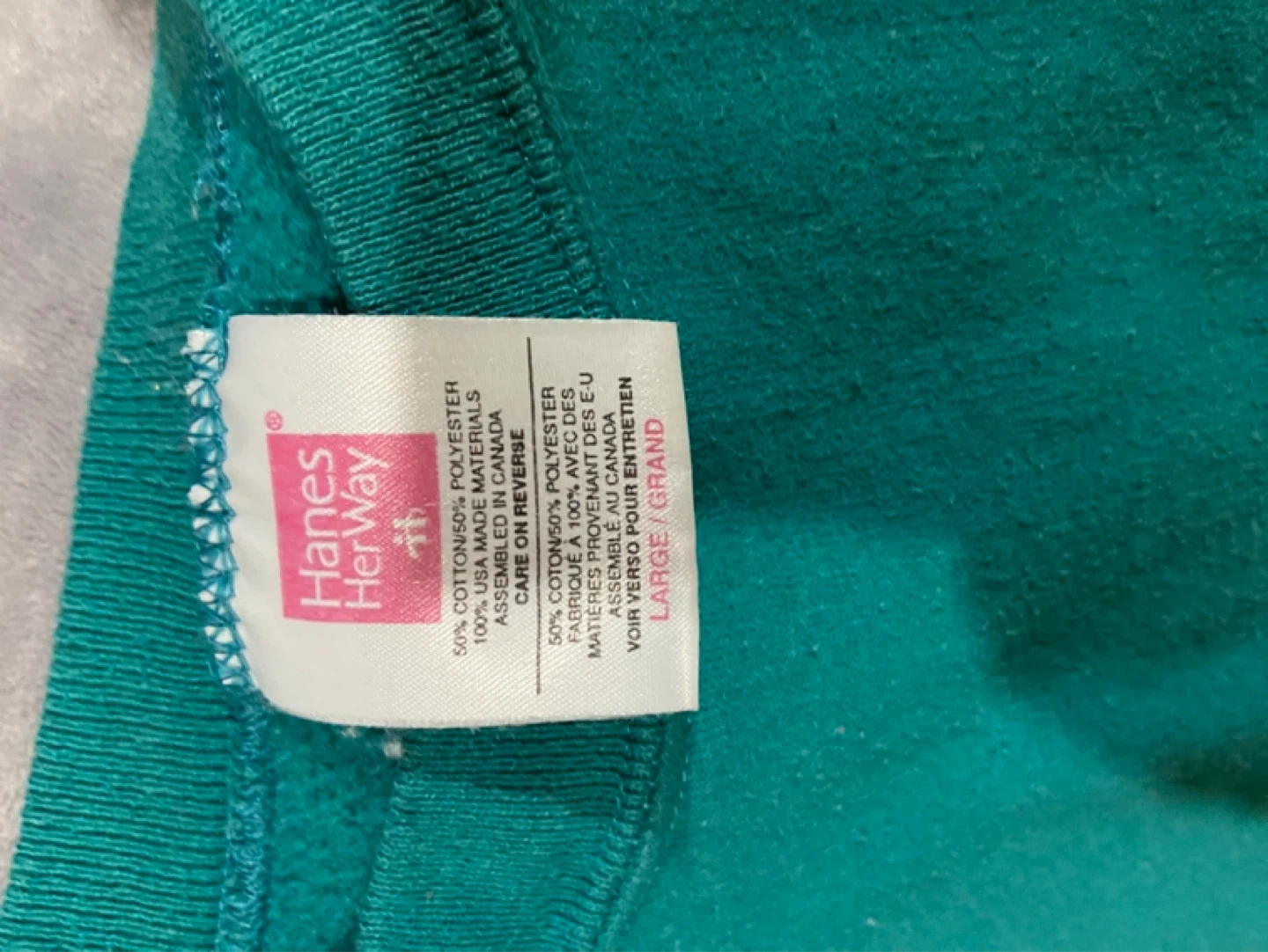 This Hanes Her Way sweatshirt and matching pants set is teal. It's made from a 50% cotton, 50% polyester blend. The sweatshirt is size large, and the pants are size medium. Asking 15 obo vintage