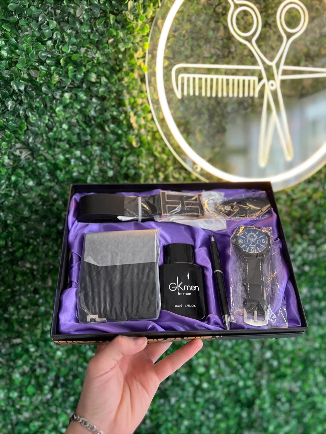 This GK Men gift set includes a stylish watch, a sleek wallet, a patterned belt, a classic pen, and a 100ml bottle of cologne. It's a complete accessory package for any man. Perfect for special occasions or everyday wear!
