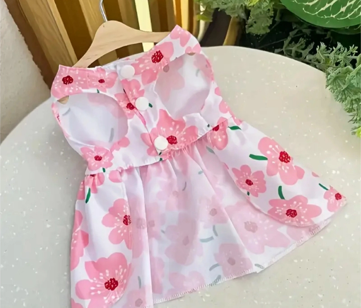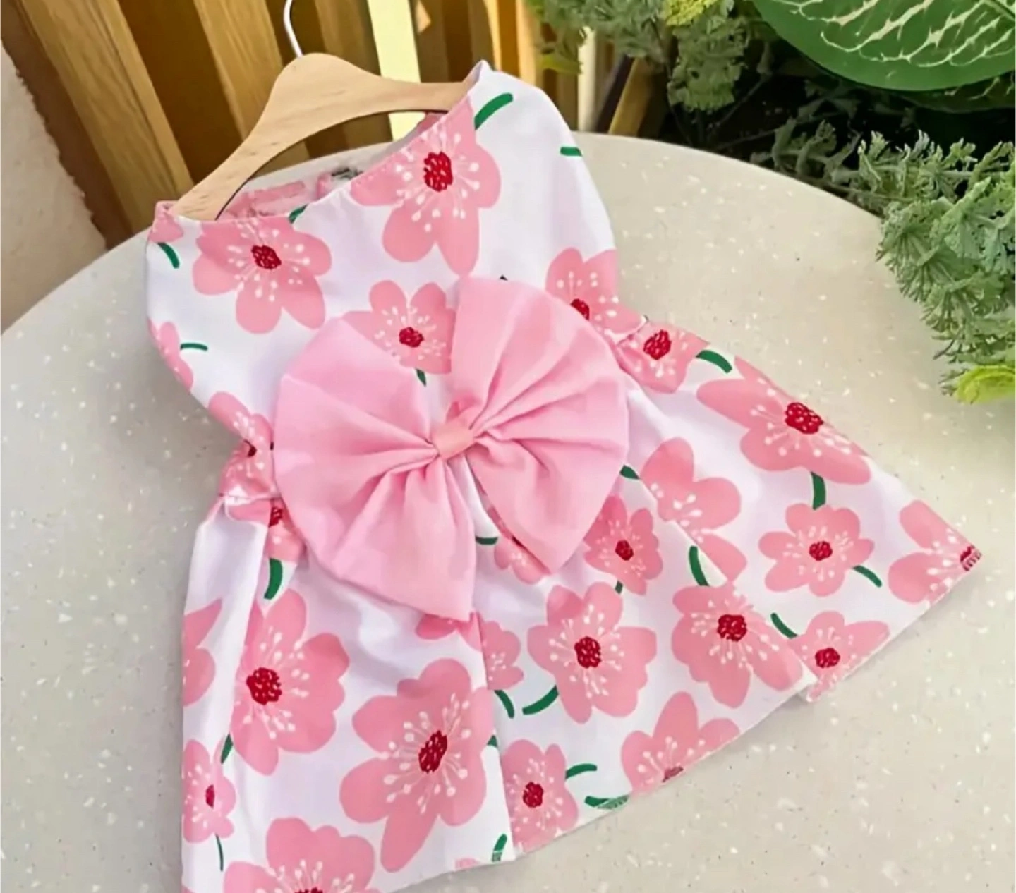 Super cute floral dog dress in pink and white! It features a charming floral pattern and a sweet bow accent, perfect for your furry friend. It's in great condition and ready for a new home