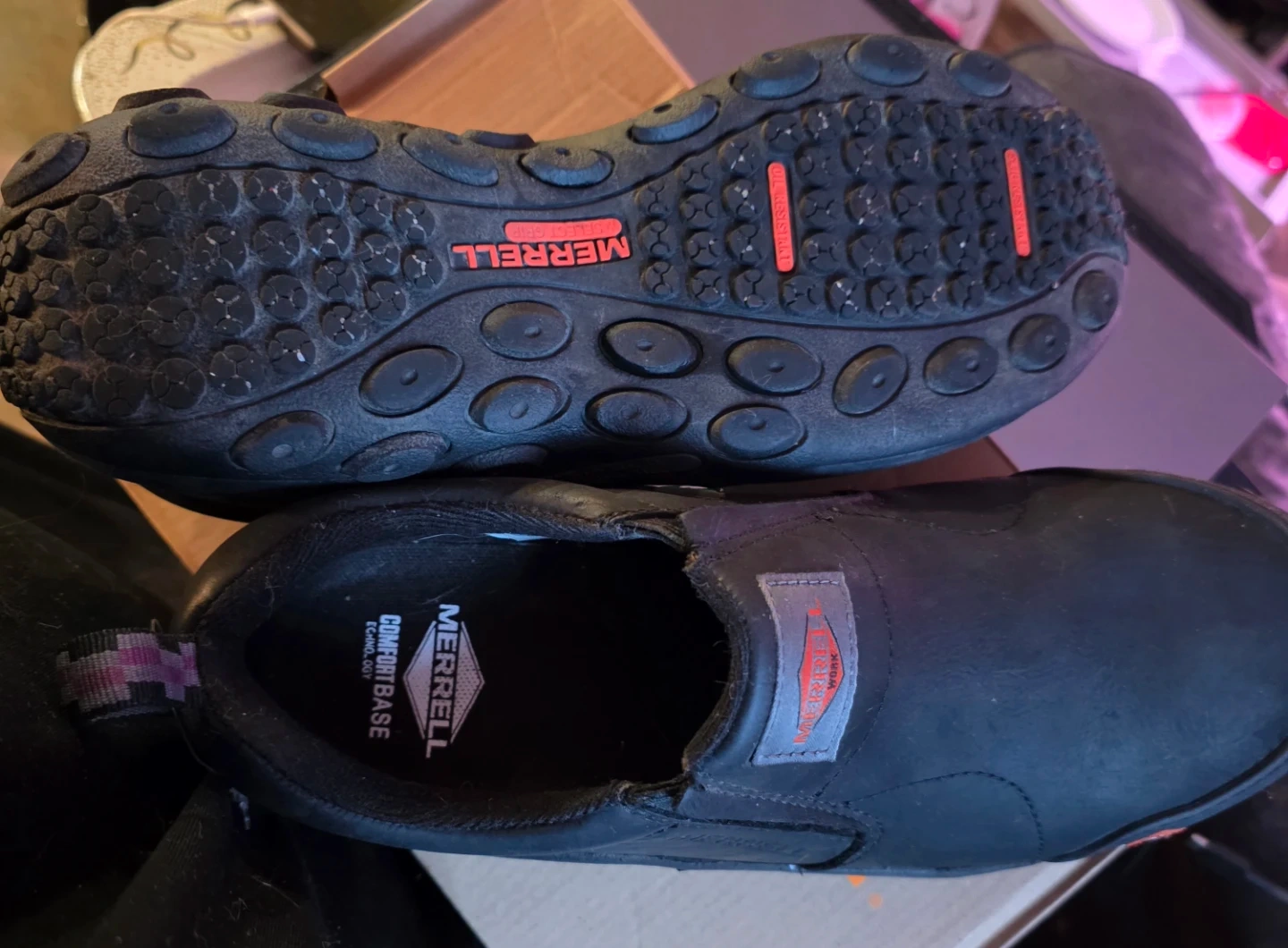 These Merrell Jungle Moc work shoes are black leather with a composite toe and CSA compliance. They feature slip-resistant outsoles for enhanced safety. These shoes are great for jobs requiring protective footwear!