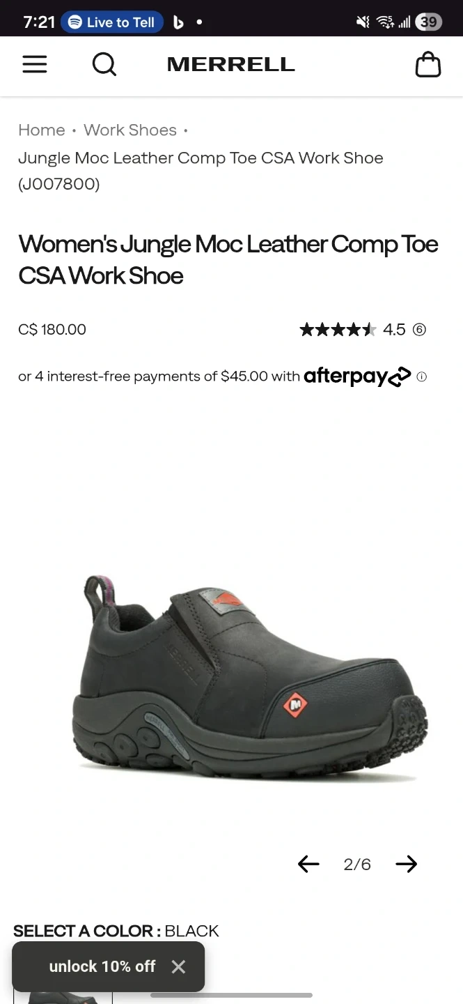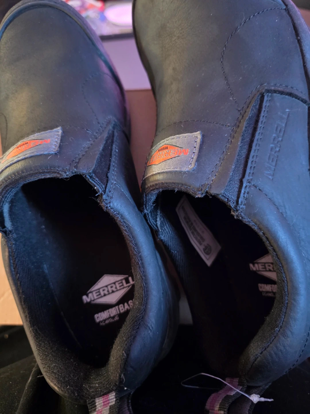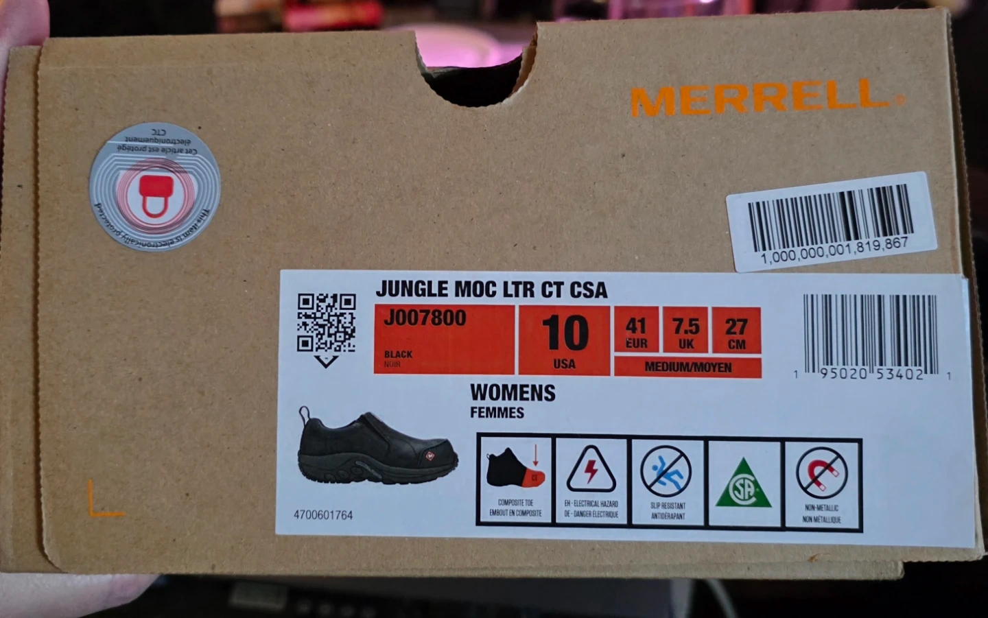 These Merrell Jungle Moc work shoes are black leather with a composite toe and CSA compliance. They feature slip-resistant outsoles for enhanced safety. These shoes are great for jobs requiring protective footwear!