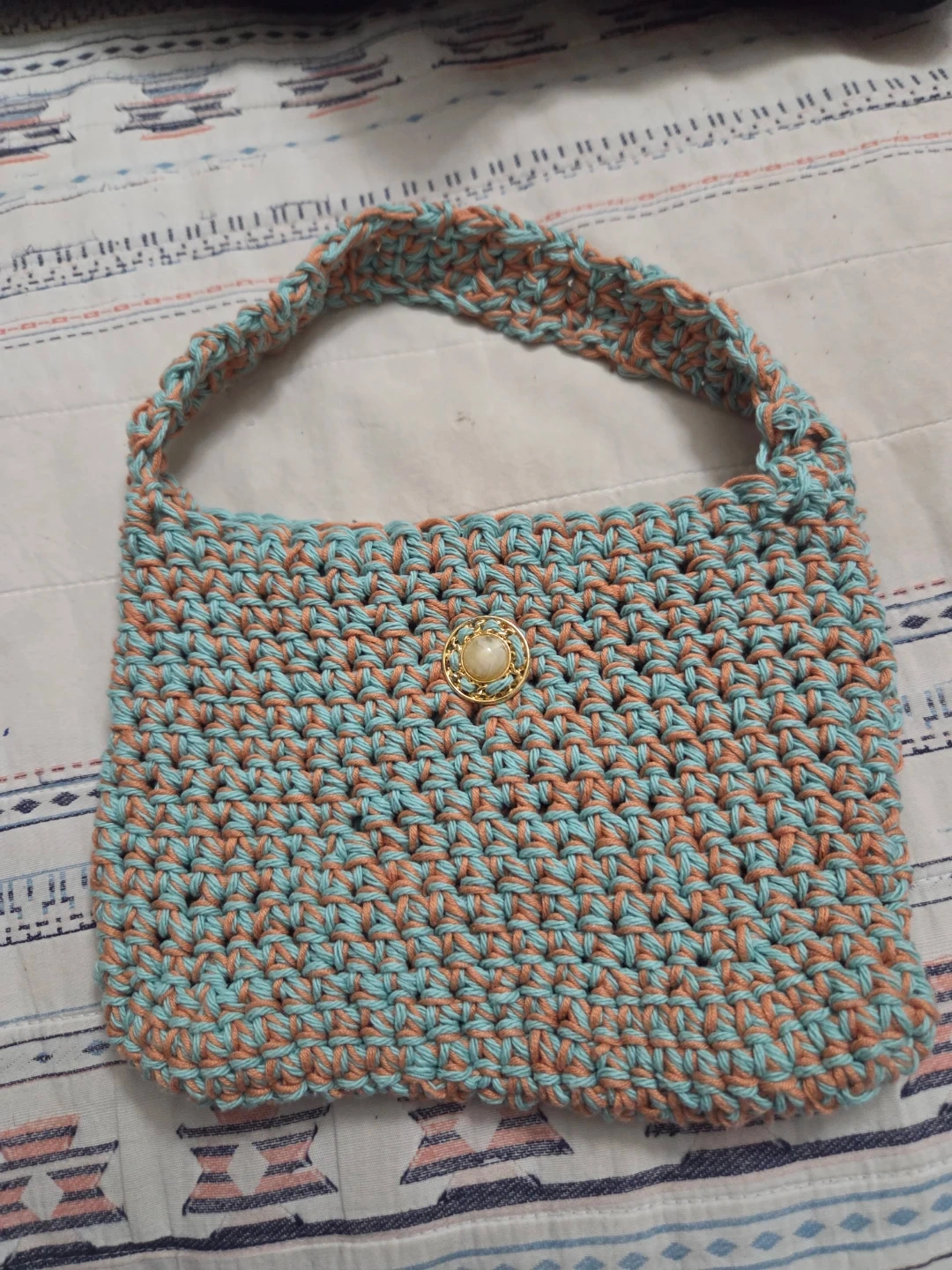 Cute two-toned crocheted bag. It's made from a blend of teal and coral yarn. Features a decorative button closure on the front.