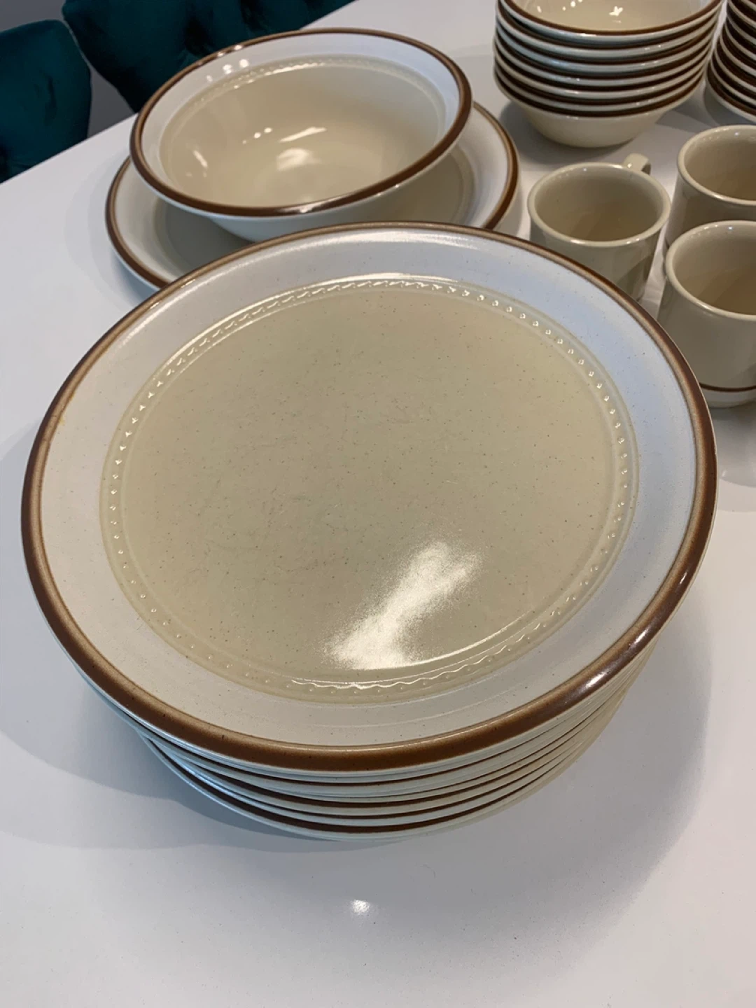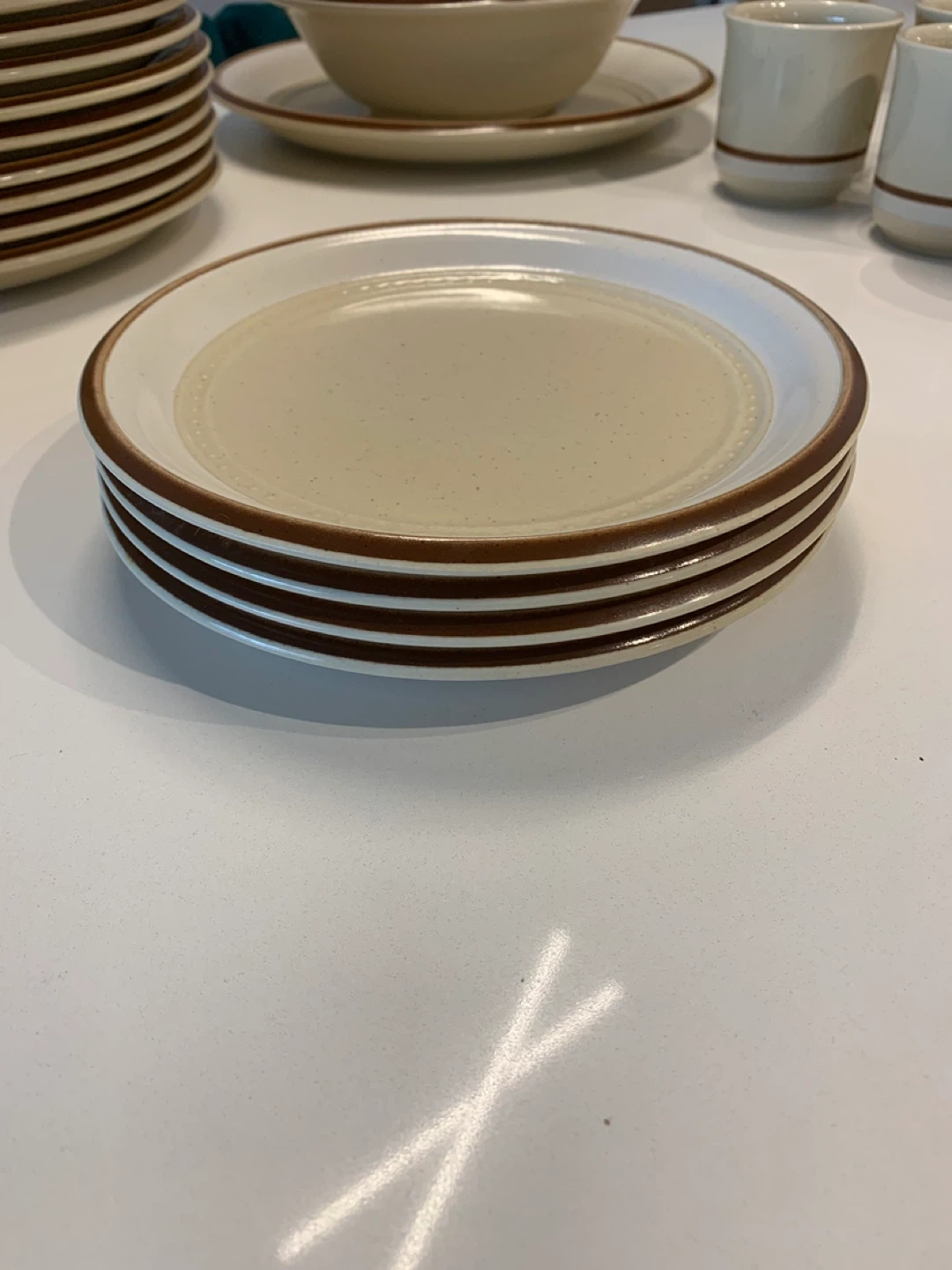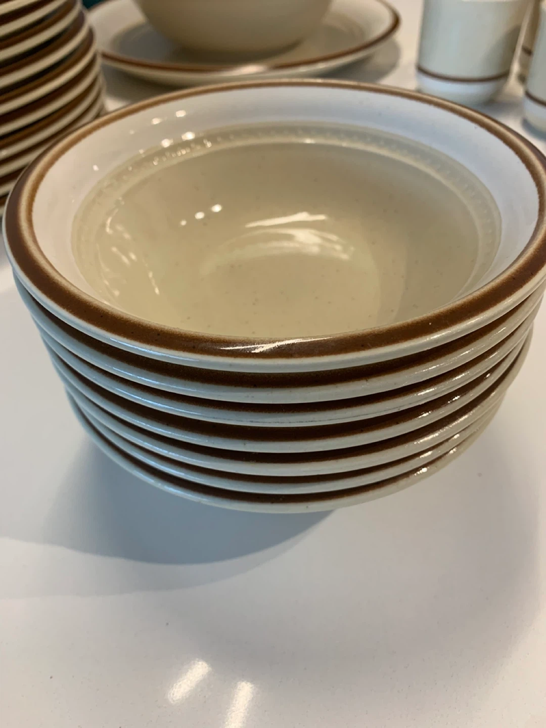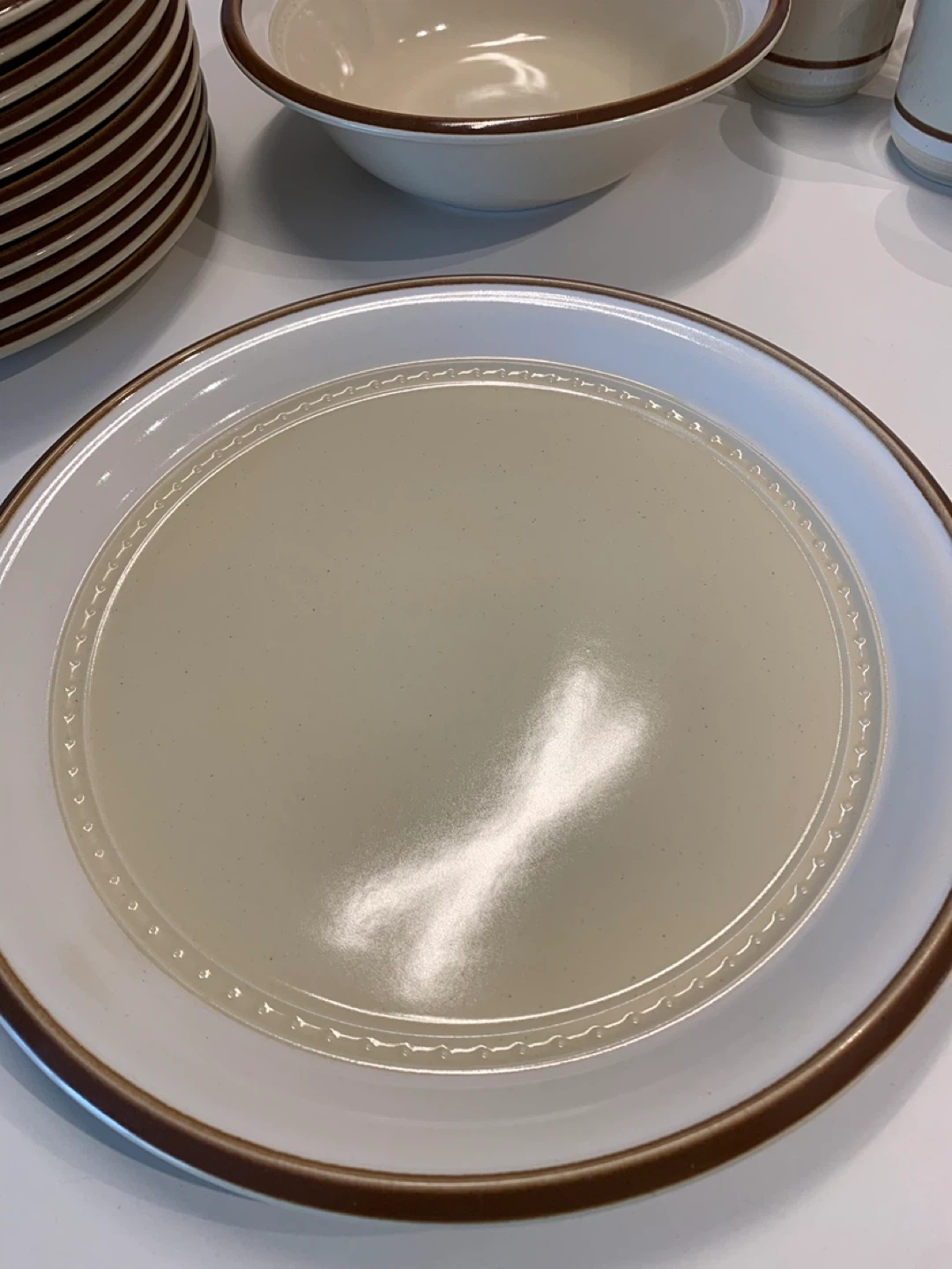 This rare immaculate set of Fuji Stone dinnerware set features a creamy beige colour with a contrasting brown band. It's durable stoneware, safe for microwave and dishwasher use. Includes plates, bowls, serving dishes and cups, perfect for a rustic vintage kitchen, cottage or chalet!