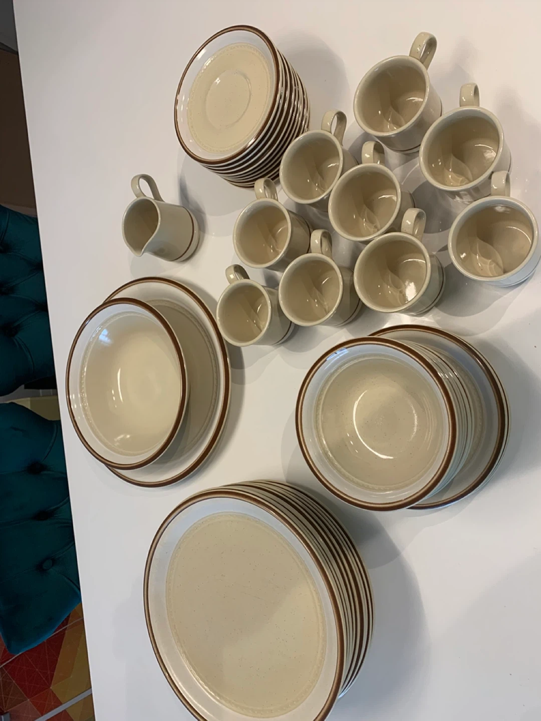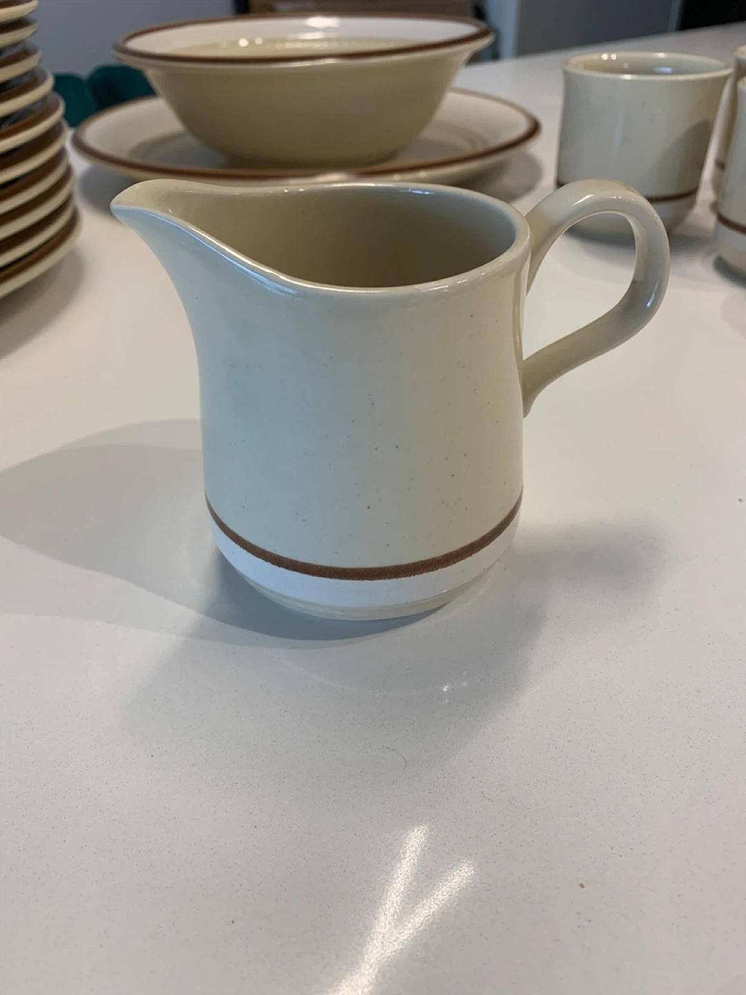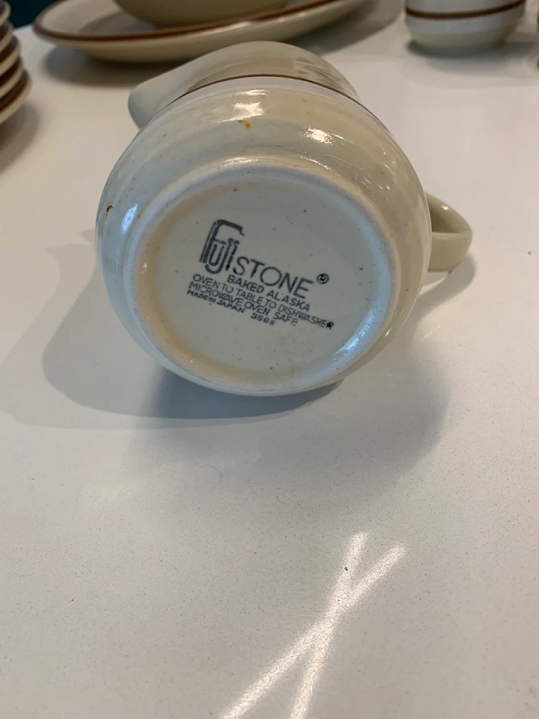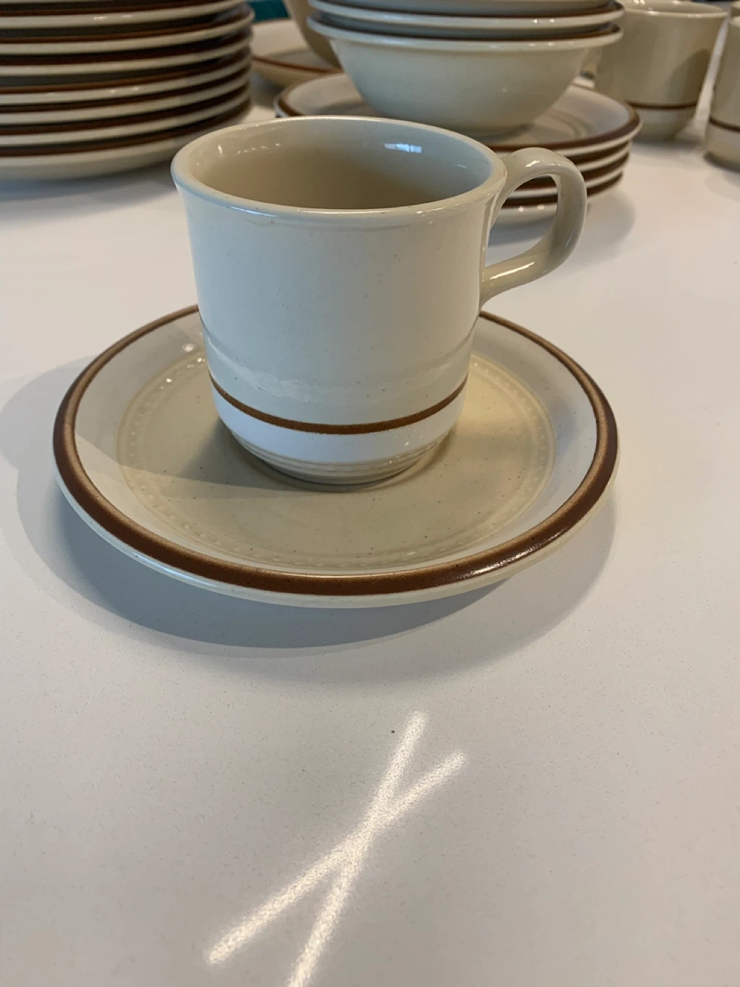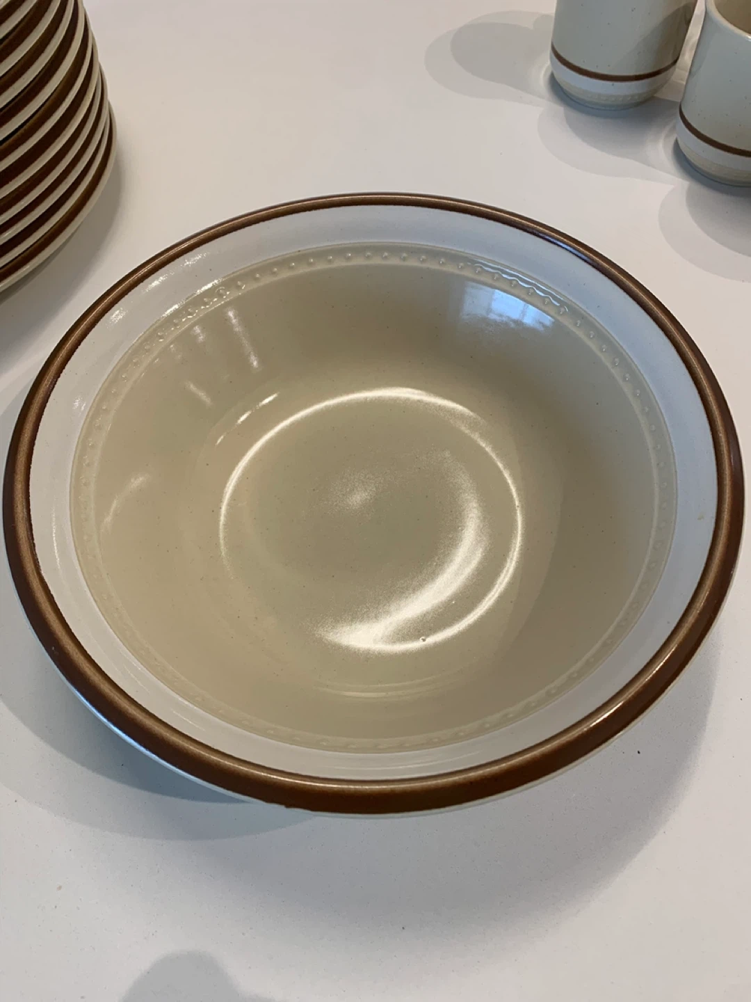 This rare immaculate set of Fuji Stone dinnerware set features a creamy beige colour with a contrasting brown band. It's durable stoneware, safe for microwave and dishwasher use. Includes plates, bowls, serving dishes and cups, perfect for a rustic vintage kitchen, cottage or chalet!