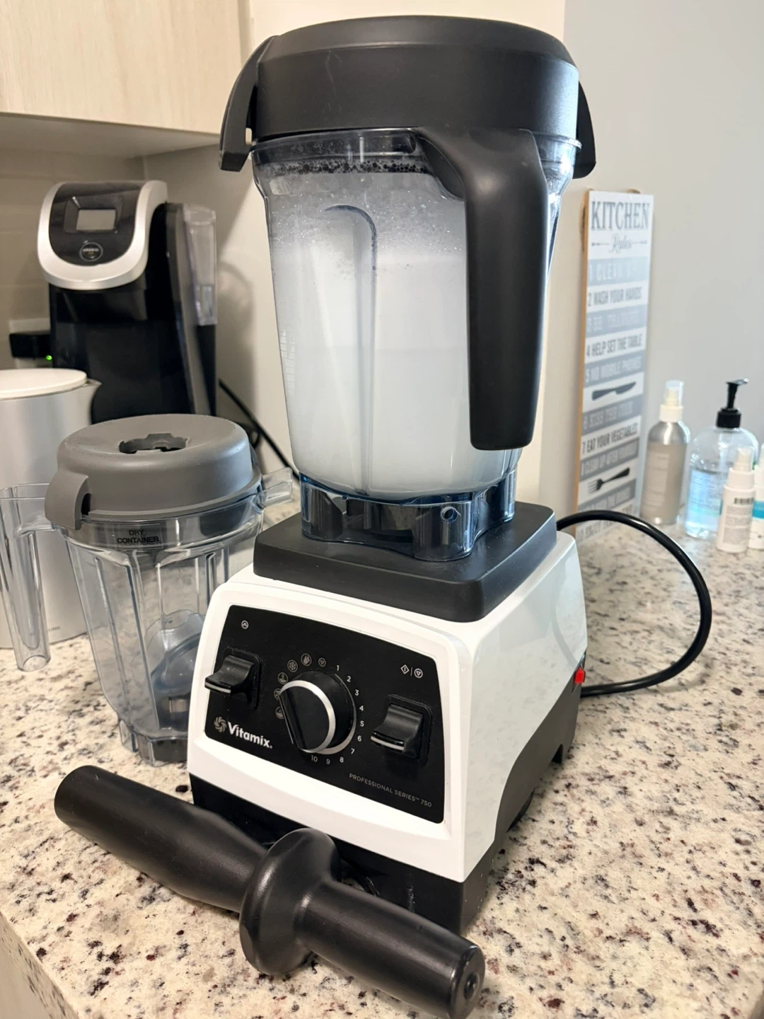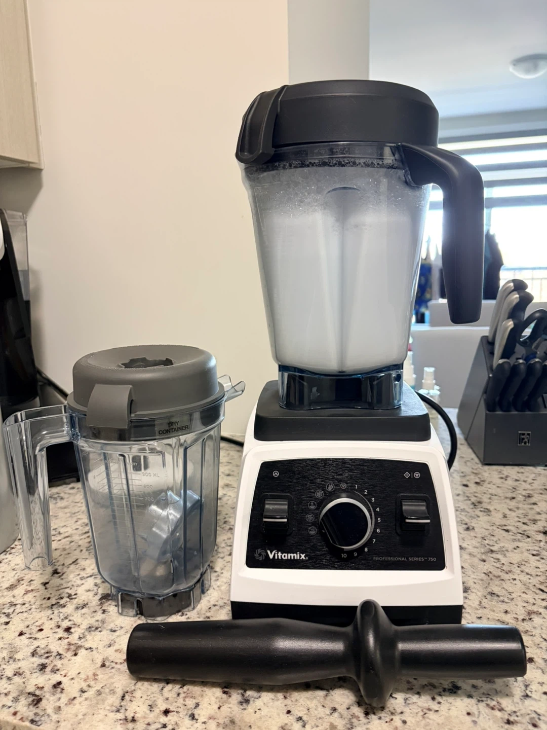This Vitamix Professional Series 750 blender comes in white. It's a powerful kitchen appliance for making smoothies, soups, and more. Includes the tamper accessory, manual and recipe book. Comes with coffee/grain grinder as well.