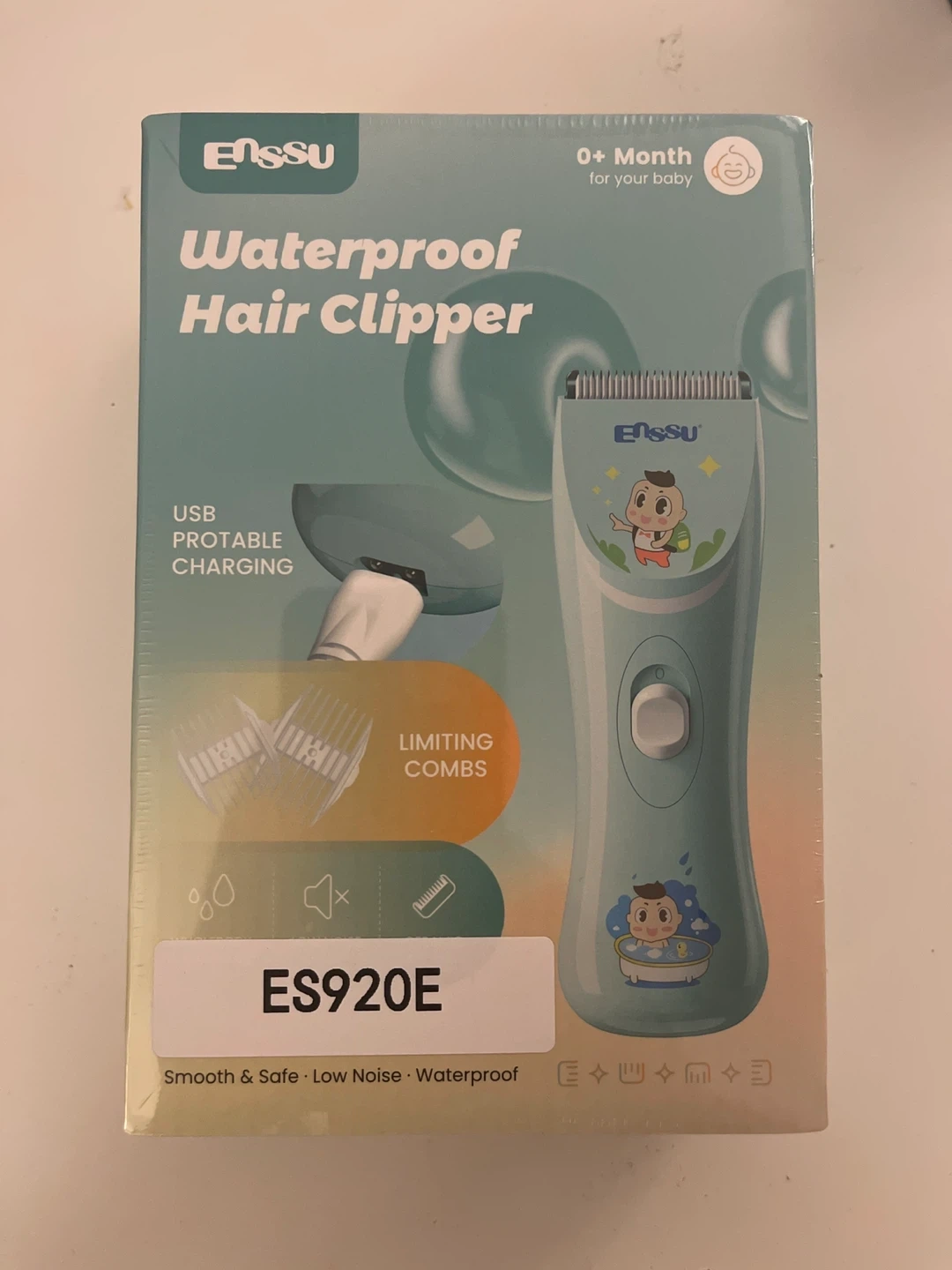 This ENSSU waterproof hair clipper is designed for babies 0+ months. It features USB portable charging and comes with limiting combs. The clipper is smooth, safe, and low noise for a comfortable experience. It's rechargeable and made with ABS, POM, and stainless-steel materials.