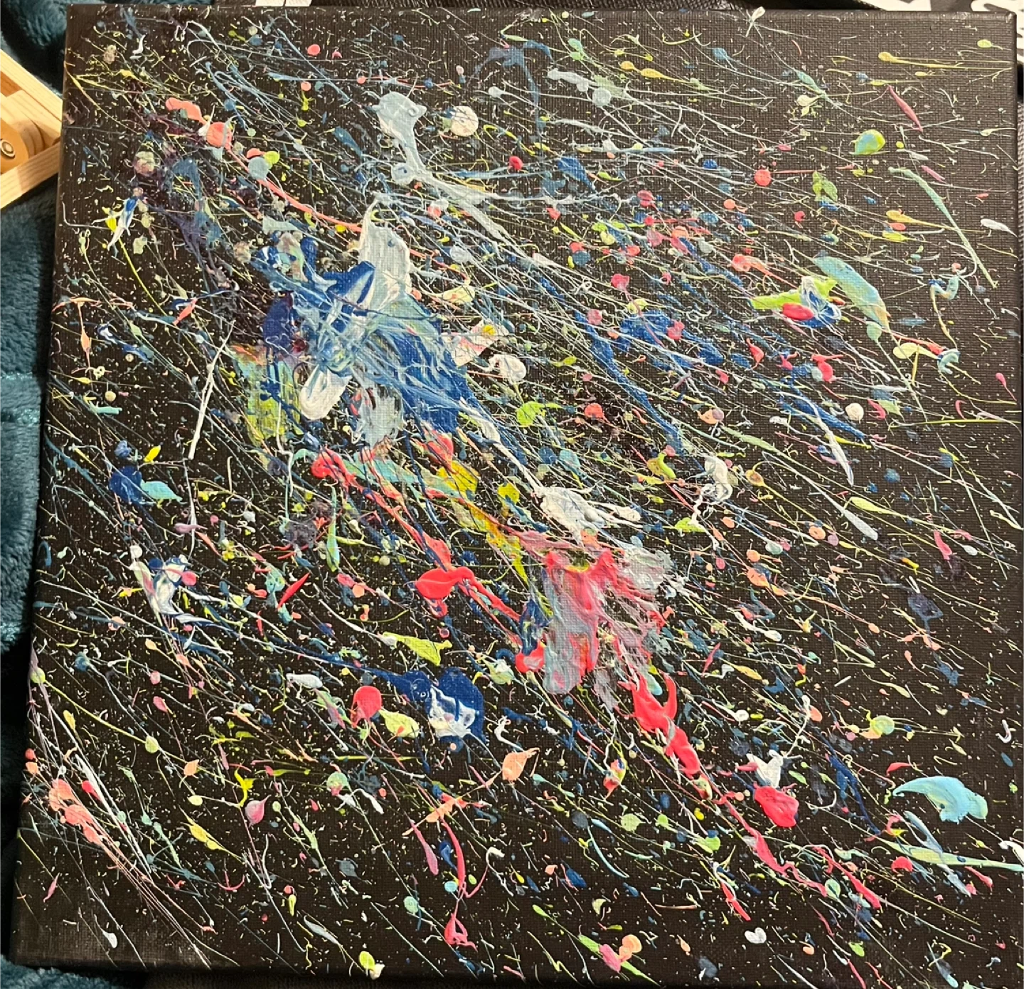 A vibrant abstract painting on canvas with a black background. It features a dynamic splatter design in various colours including blue, pink, yellow, and white. This piece adds a pop of colour and energy to any space!